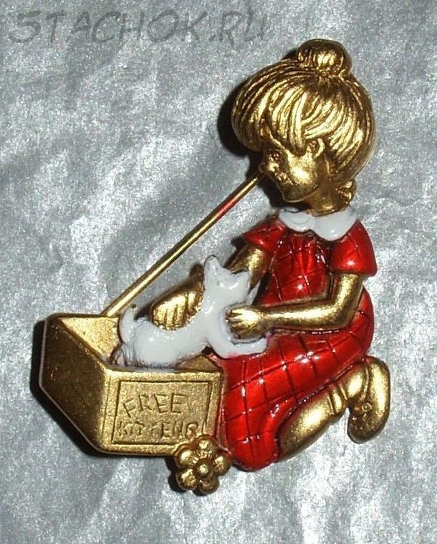 Очаровательная, милая брошечка! Девочка принесла в коробке маленького беленького котенка, чтобы найти ему доброго и любящего хозяина! Размер брошки 3.5*4.5см Винтаж 1980-х гг. Брошь в отличном винтажном состоянии. Изделие ранее не использовалось. Маркирована Производство Danecraft (США).