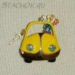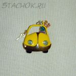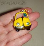 У дамы зеленое лицо, волосы, которые встали дыбом, всех оттенков радуги,свитер сиреневого цвета, сама машинка-жук ярко-желтого цвета, фары голубенькие, колесики черные, а бампер, ключик под блестящее золото!