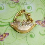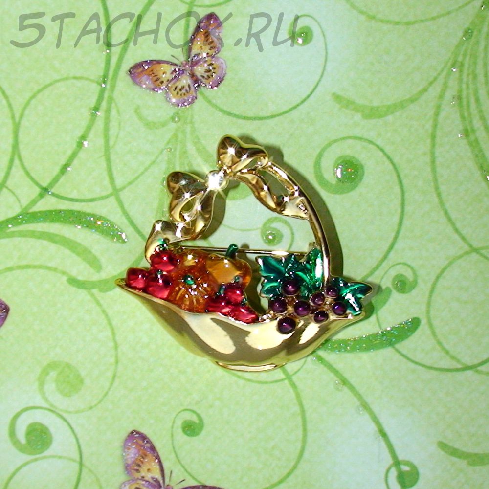 Брошь выполнена под блестящее золото с использованием блестящей перламутровой эмали. В корзинке видны фрукты: темный виноград, апельсины, яблоки и ягоды. Корзина украшена бантиком со стразиком, который ярко переливается на свету!