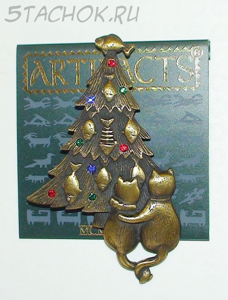 Брошь "Кот и кошечка у новогодней елочки" под бронзу с камушками сваровски