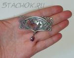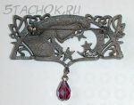 Брошь из пьютера (оловянный ювелирный сплав), ювелирная эмаль сиреневого цвета с блестками, камушек малинового цвета с перламутром.