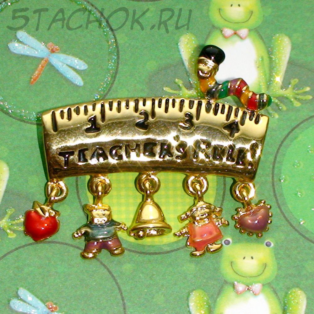 Брошка стилизована под линейку, на которой написано "Учительское правило". Под ней подвижно расположены мальчик и девочка, школьный звонок, яблочко и сердечко, на линейке - веселая гусеничка. Яркая эмаль нежных цветов и блестящий золотистый цвет придают брошке очарование, хочется все время ее рассматирвать!