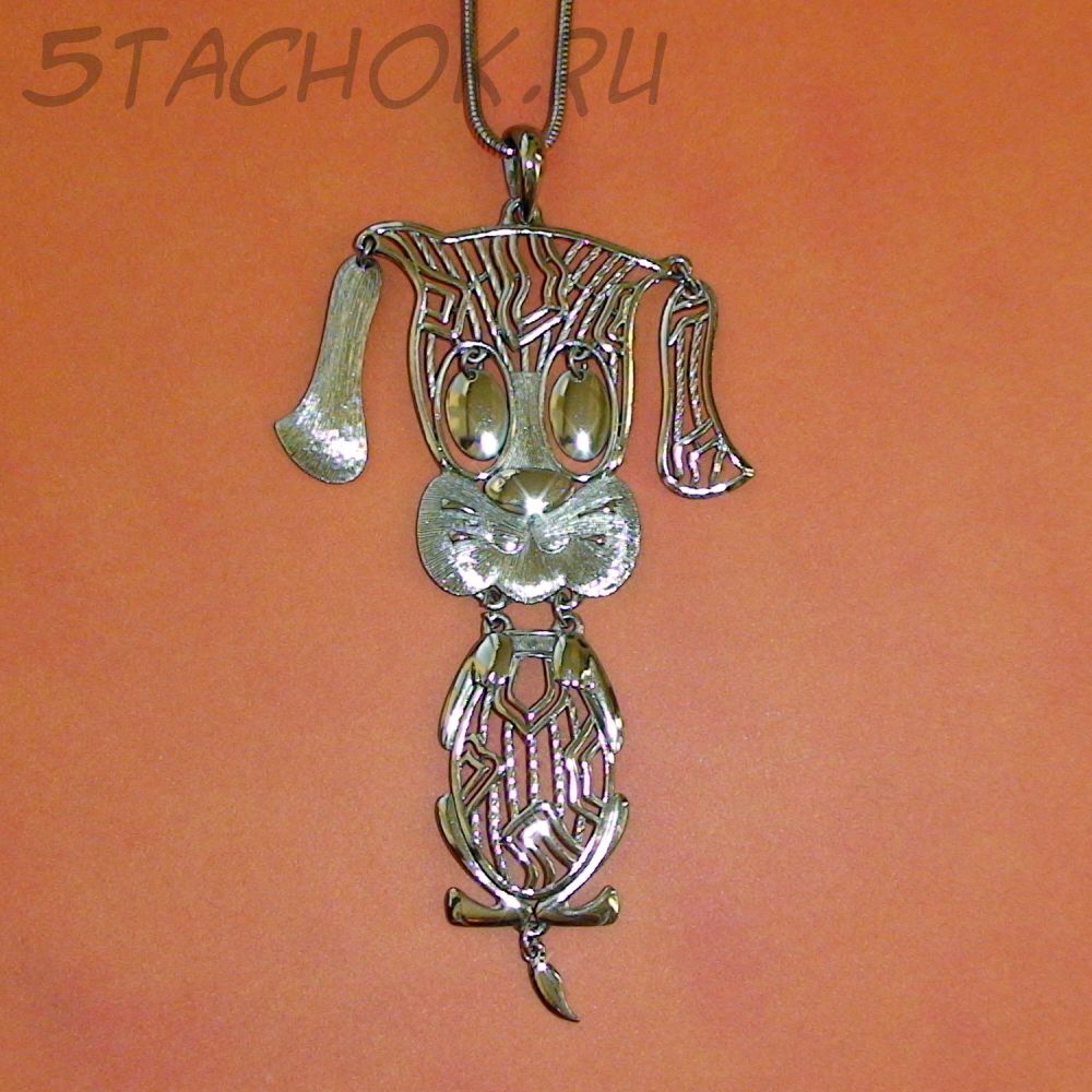 Очень редкое и оригинальное колье! У песика много подвижных деталей: ушки,глазки,мордочка, хвостик! Много ажурных деталей, прорисованы шерстка, мордочка! И даже ушки у песика разных рисунков! Очень напоминает героя мультфильма бассет-хаунда "Друпи"! Находка для девушки или молодой женщины, которая любит крупные украшения и, разумеется, собачек! Размер кулона-подвески 6*12см Длина цепочки-змейки 60см Винтаж 1980-е гг. Маркирована Alan (США)