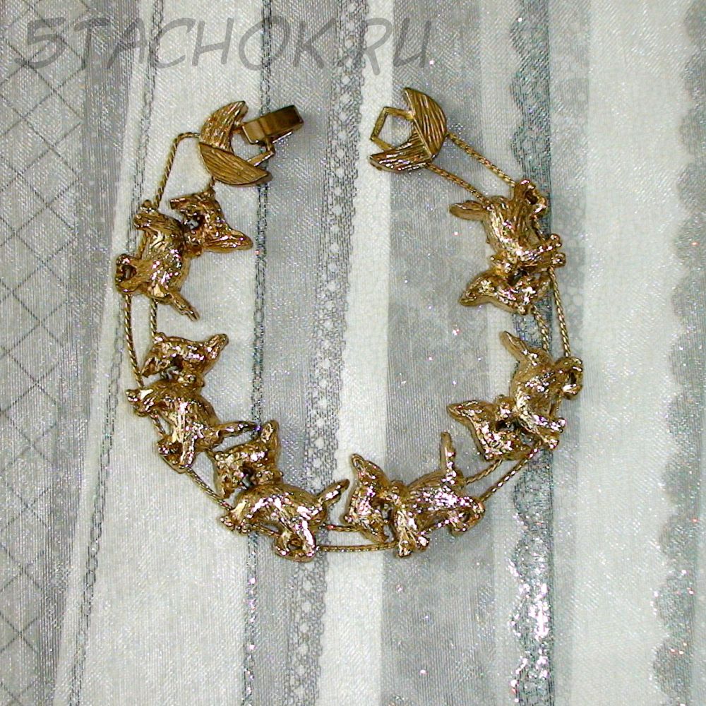 Симпатичный браслетик. Выполнен в блестящем золотом исполнении с прорисованной фактурой шерсти песиков. Песики подвижны вдоль веревочек. Общая длина браслета 20см, но она может быть и уменьшена. Отличный подарок любителю терьерчиков и песиков! Общая длина браслета 20см Немаркировано. Коллекционная винтажная бижутерия 1980-е годы. Производство США Отличное винтажное состояние. Изделие ранее не использовалось.