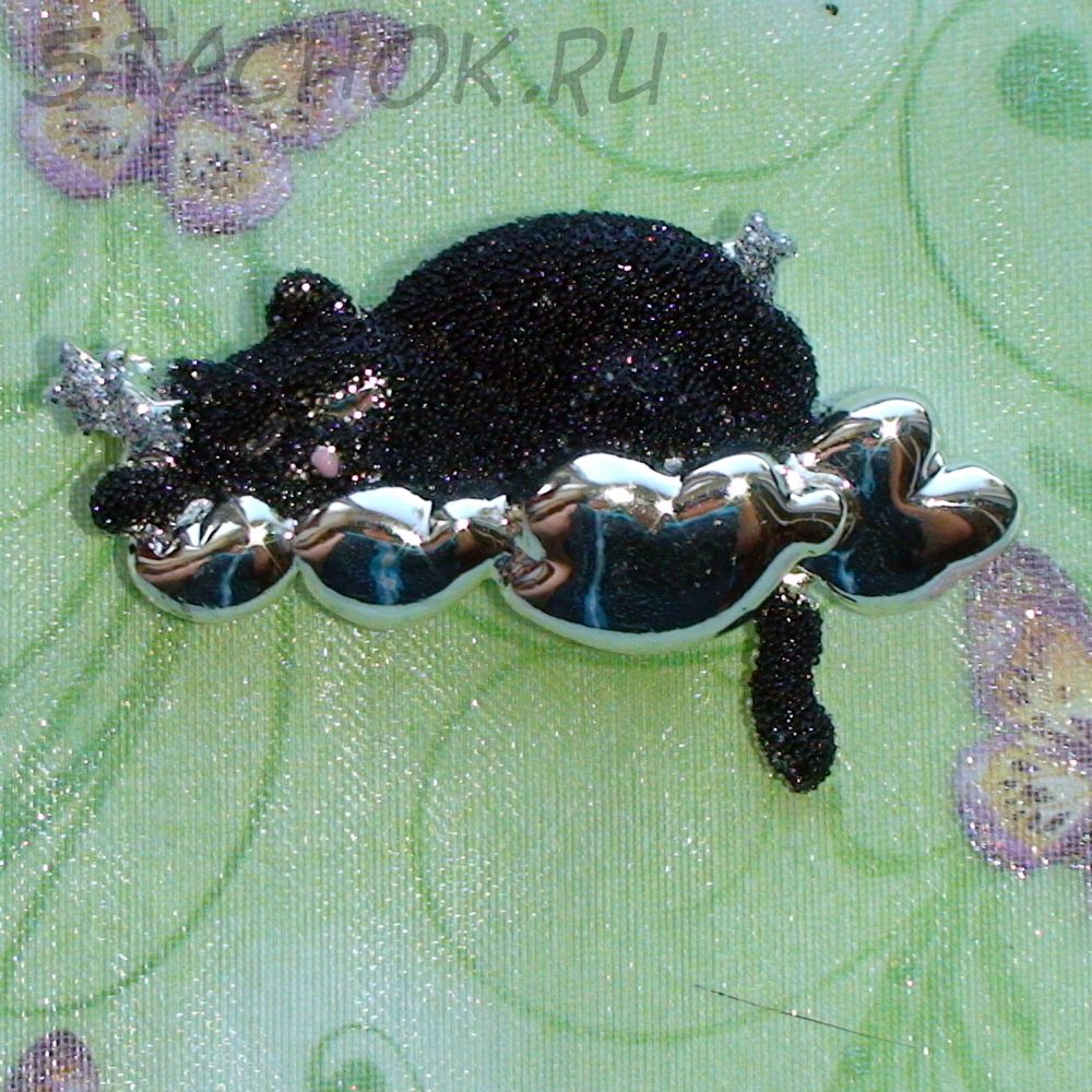 Брошь "Черный котик спит на облаке" под серебро/крошка