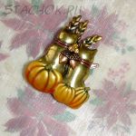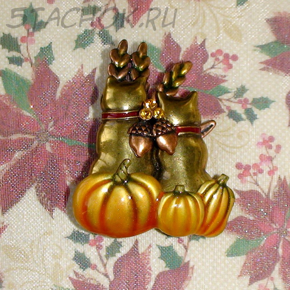 Брошь "Два котика и урожай" под бронзу, медь, эмаль, стразы