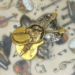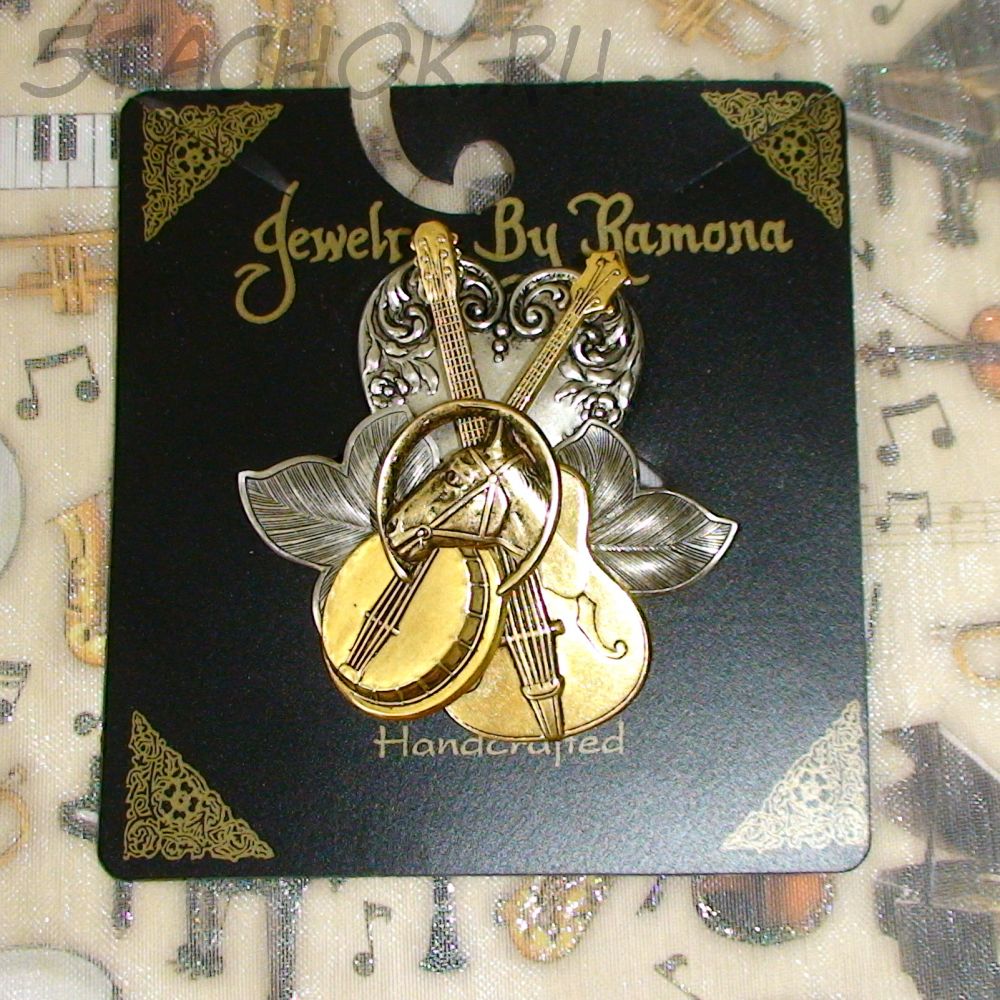 На брошке изображены музыкальные инструменты: джазовая гитара, банджо, лошадиная голова и подкова. Все вместе это символизирует народный музыкальный стиль Америки - кантри.