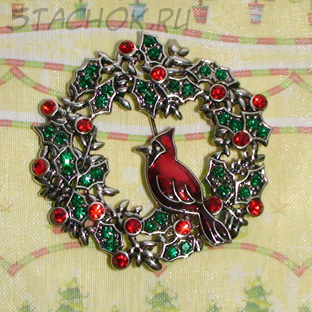 Брошь "Кардинал" под серебро, эмаль, стразы