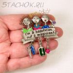 Забавная, оригинальная и редкая брошечка из пьютера. Волосы у девушек разных цветов из спиралек-проволочек. И им можно сделать разные прически. Надпись на брошке: "Я косметолог, я не маг".  На брошке есть все, что требуется стилисту: ножницы, расческа, фен, лак для ногтей и шампунь. Прекрасный подарок стилисту, косметологу, парикмахеру, любой девушке или молодой женщине!