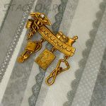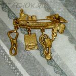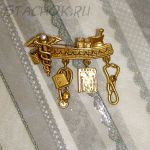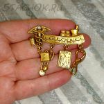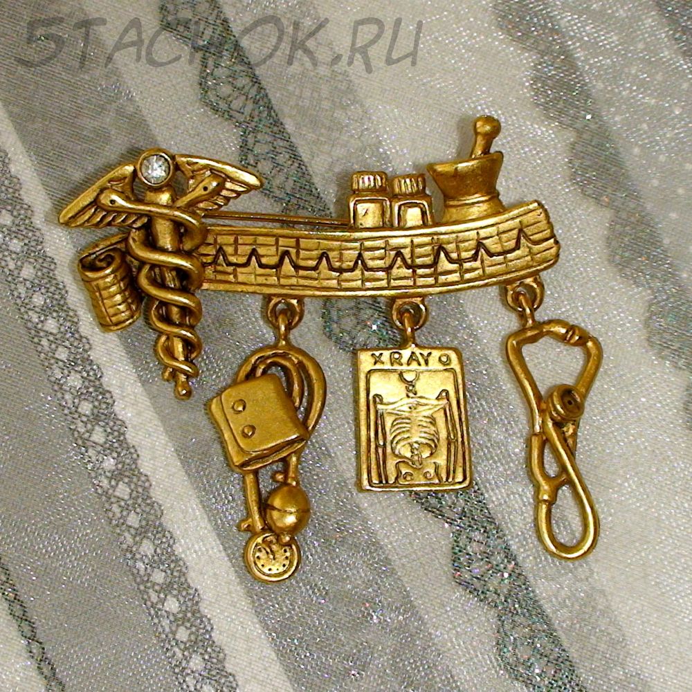 На броши изображены символ медицины "змея и жезл", в вершине которого расположен стразик, кардиограмма, на ней расположены баночки с лекарствами и ступка для измельчения и смешивания, снизу расположены подвижные элементы броши: тонометр, стетофонендоскоп, рентген-снимок человека.