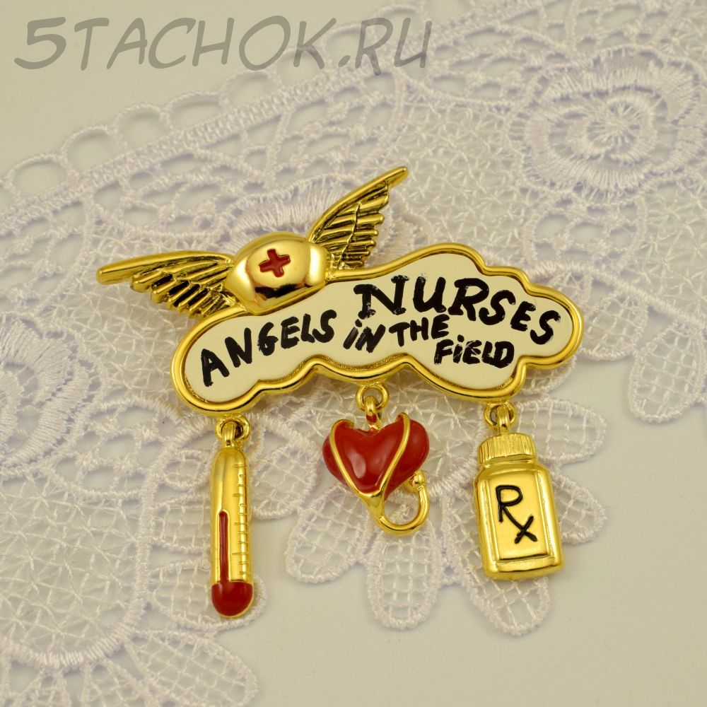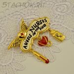 Выполнена под блестящее черненое золото с использованием блестящей эмали белого, красного и черного цветов. На брошке надпись: "Медсестры - ангелы на поприще".