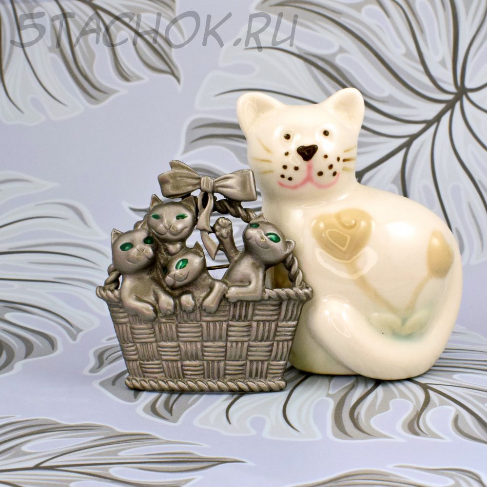 Брошь "Милые котята в корзинке" цвет олова (AJC США)