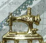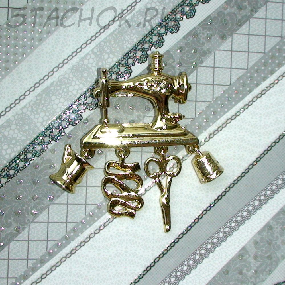 На машинке прорисованы детали. Инструменты, необходимые для портного : ножницы, шпулька с иголочкой, сантиметр и наперсток имеют подвижность относительно броши.