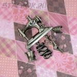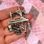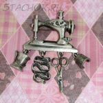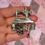 На машинке прорисованы детали. Инструменты, необходимые для портного : ножницы, шпулька с иголочкой, сантиметр и наперсток имеют подвижность относительно броши.