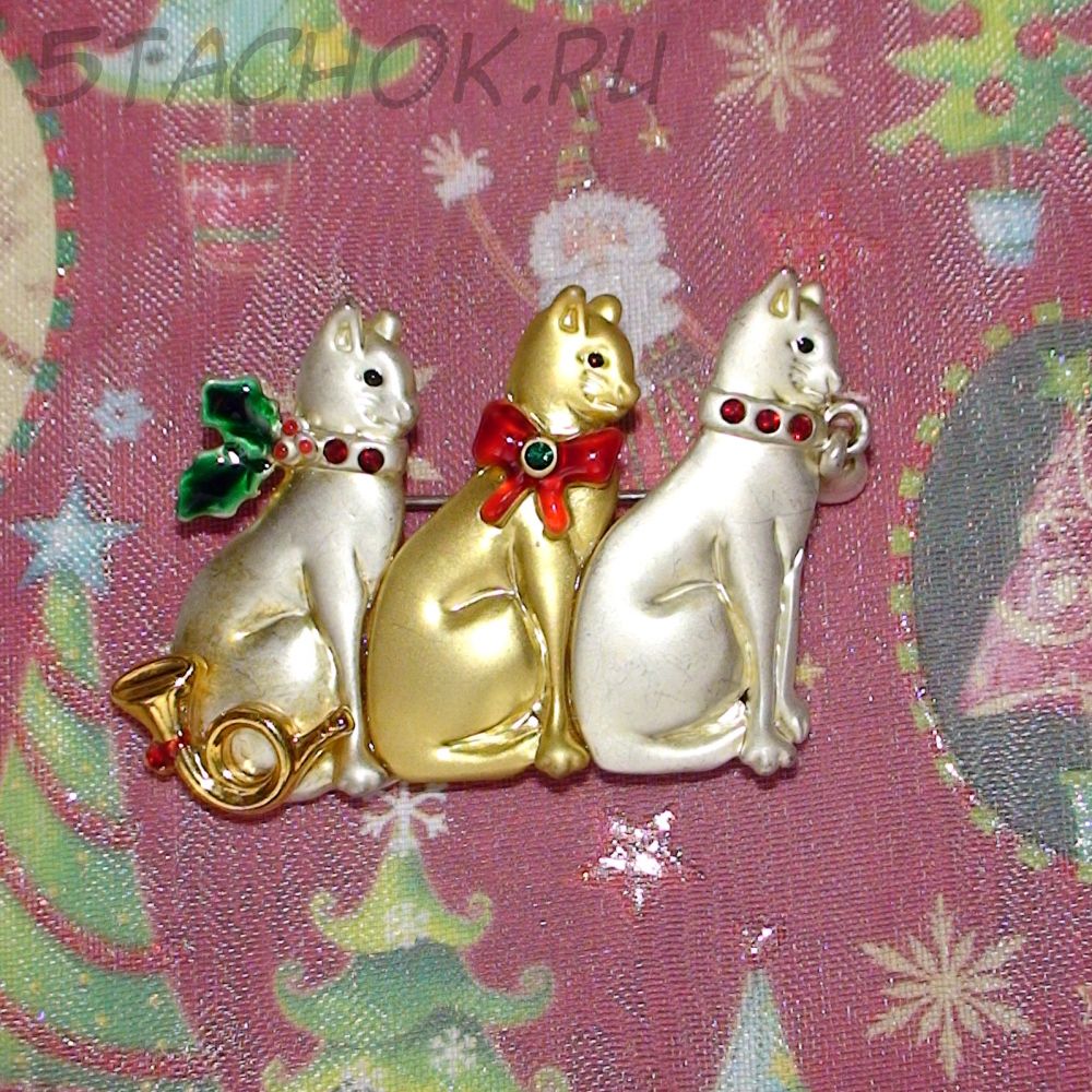 Брошь "Три новогодних котика" под золото, серебро, эмаль, стразы