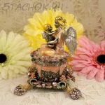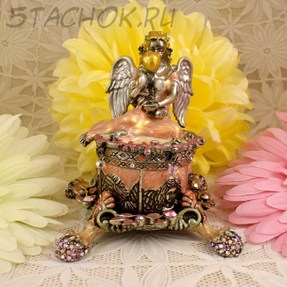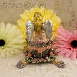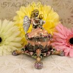 Фирменные стразы-хамелеоны от Kirks Folly завораживают своим сиянием при любом освещении. Перламутровая эмаль нежных пастельных тонов. Шкатулка состоит из трех частей: основание, шкатулка и крышечка. На шкатулке изображены херувимы. Прорисованы все мельчайшие детали ангелов.