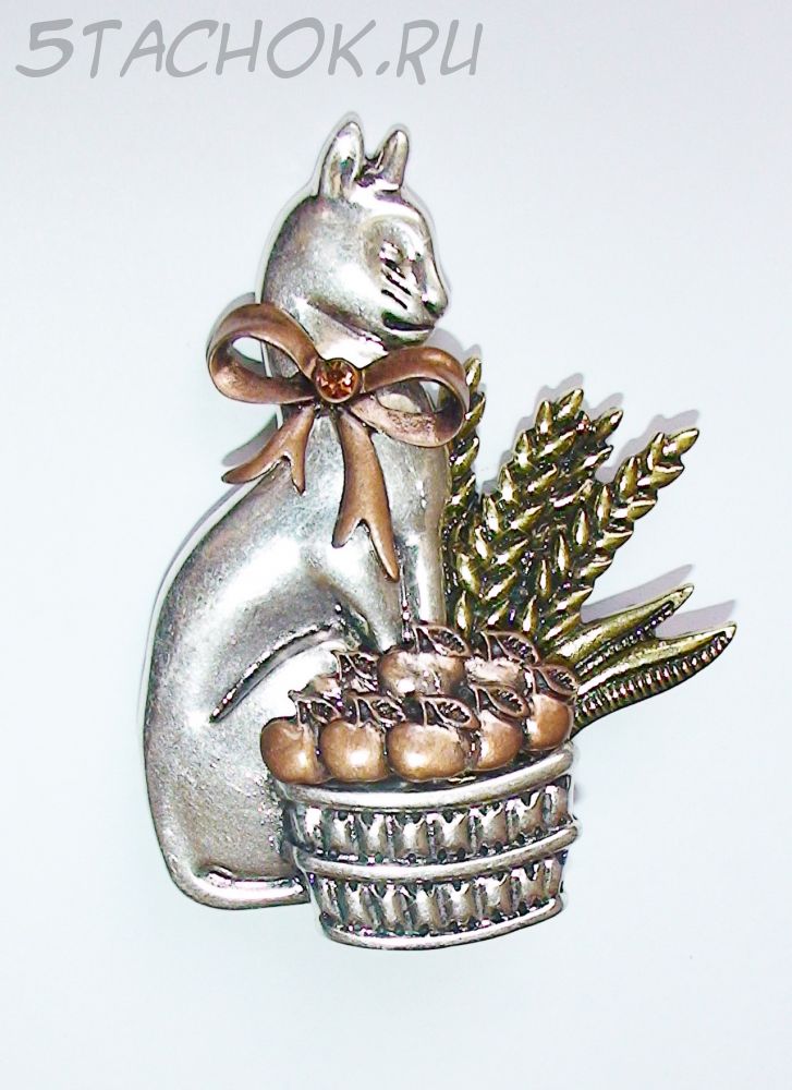 Кошечка и корзинка выполнены в материале под блестящее серебро, бантик и яблоки - под блестящую медь, а колоски под блестящую бронзу. На бантике кошечки ярко переливается камушек!