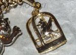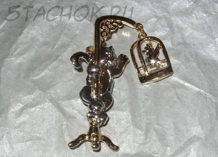 Брошь "Кот и попугай в клетке" под серебро и золото