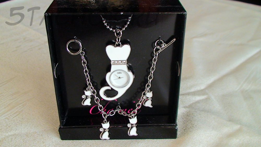 Часы женские кулон с цепочкой и браслет с котятами белый