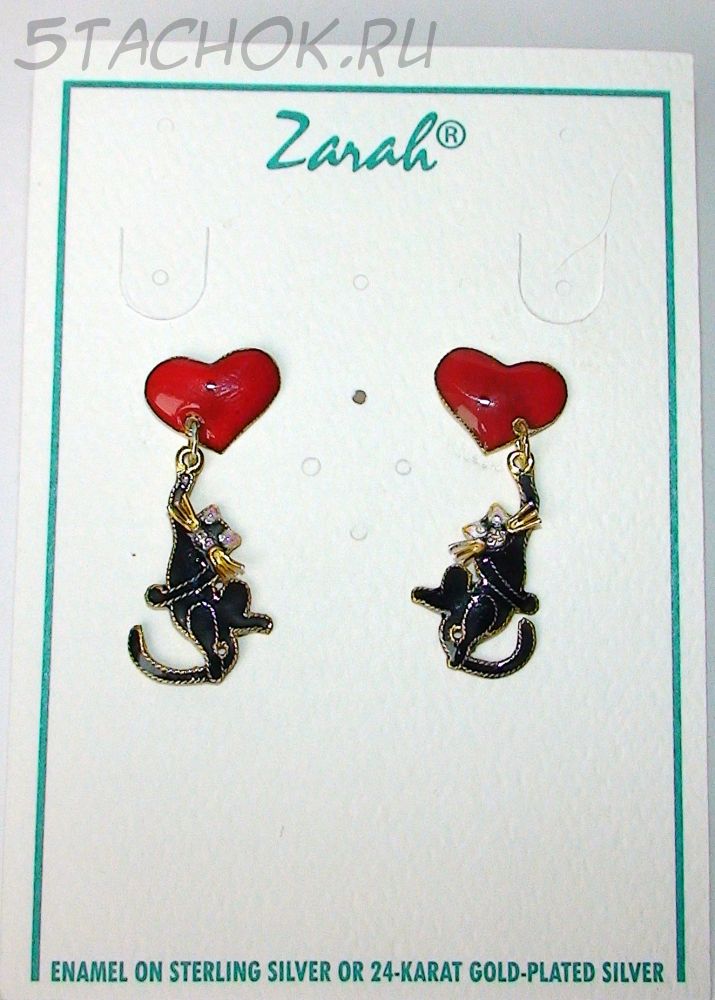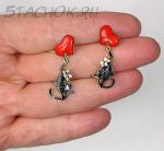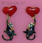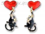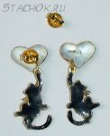Серьги-гвоздики "Черный кот висит на сердечке" серебро 925, ювелирная эмаль