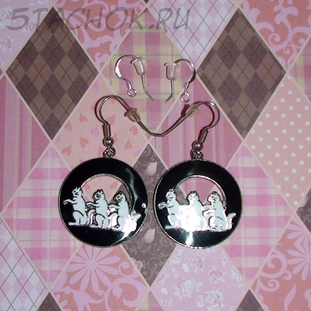 Серьги "Три белых котика" под серебро, ювелирная эмаль