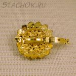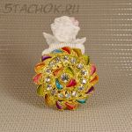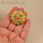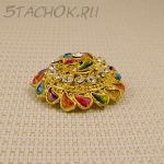 Выполнена в цвете блестящего золота с использованием разноцветной блестящей перламутровой эмали и крупных страз белого цвета.