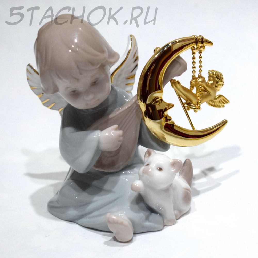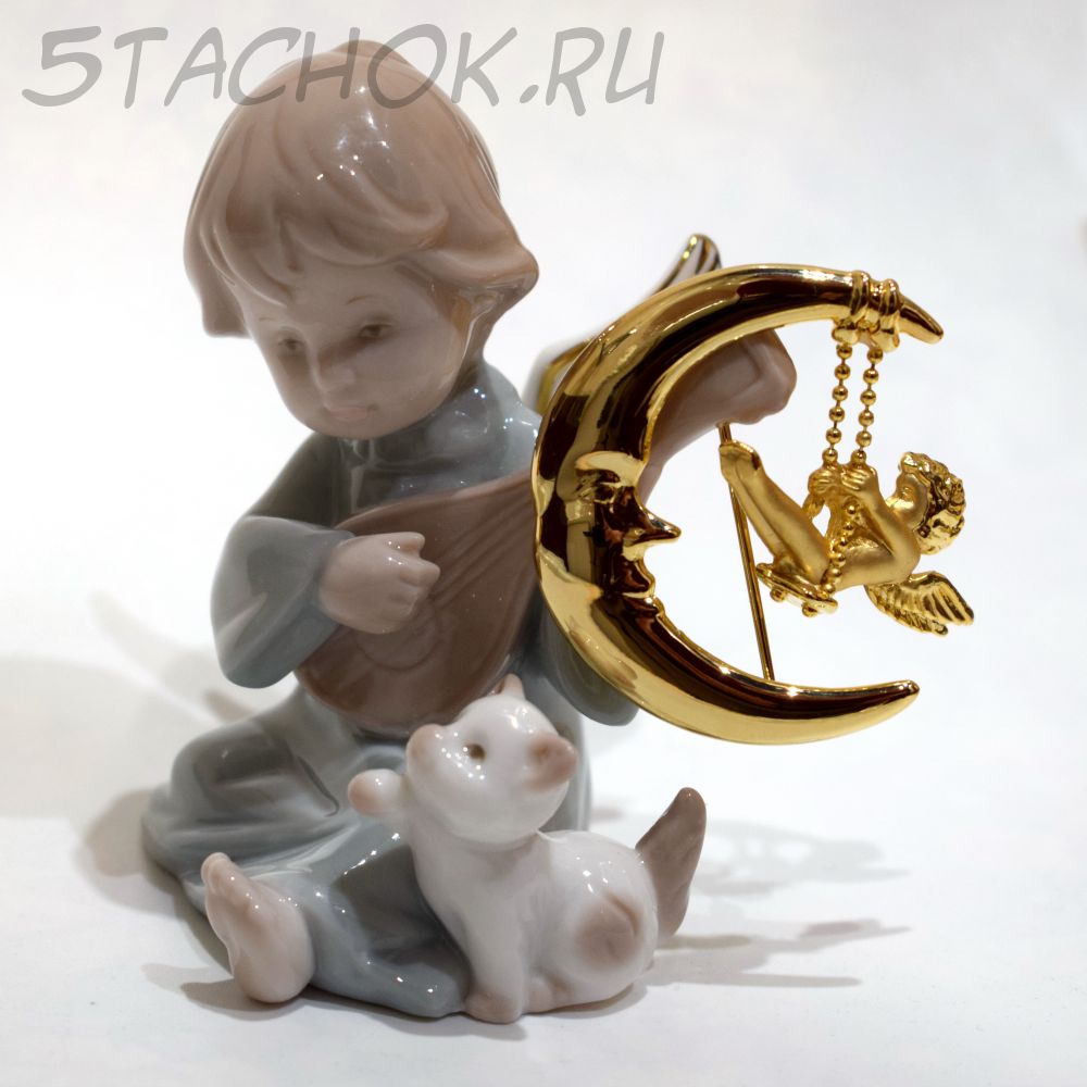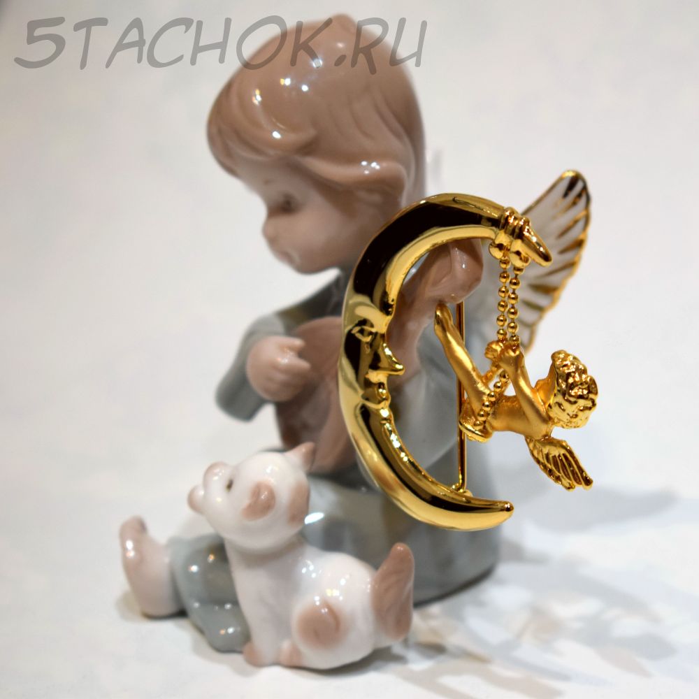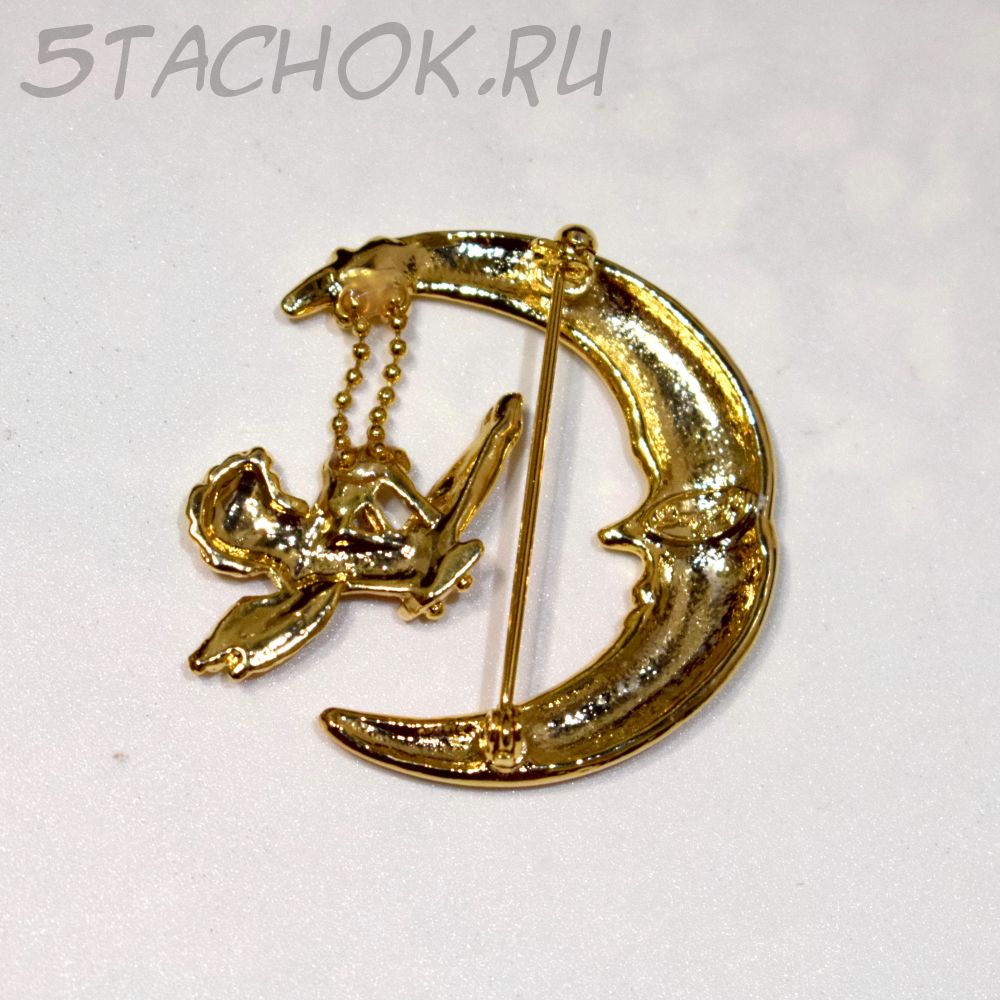 Красивая и редкая брошка! Выполнена под блестящее и матовое золото. Ангелочек катается на луне на качелях. Малыш имеет подвижность относительно луны.