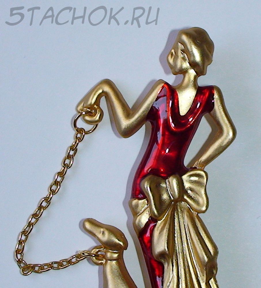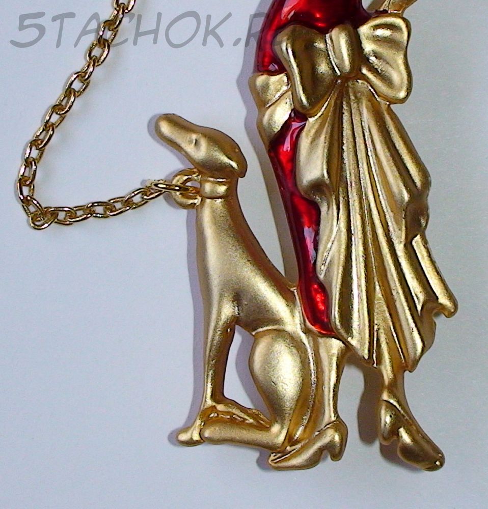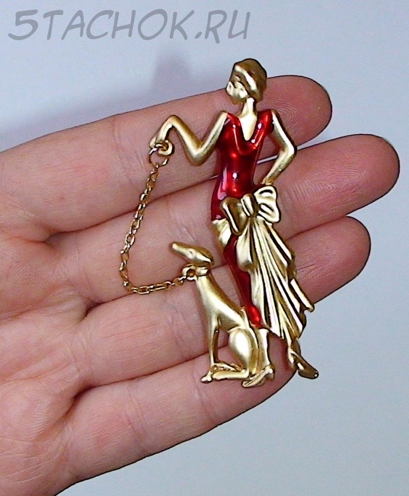 Брошь "Дама в красном с собакой" под золото/эмаль