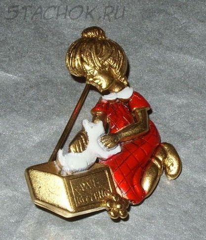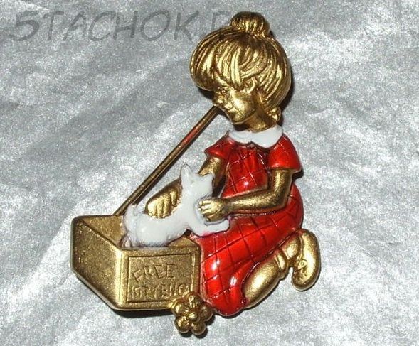 Очаровательная, милая брошечка! Девочка принесла в коробке маленького беленького котенка, чтобы найти ему доброго и любящего хозяина! Размер брошки 3.5*4.5см Винтаж 1980-х гг. Брошь в отличном винтажном состоянии. Изделие ранее не использовалось. Маркирована Производство Danecraft (США).