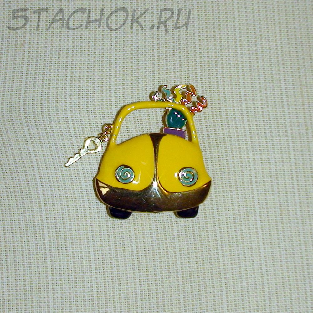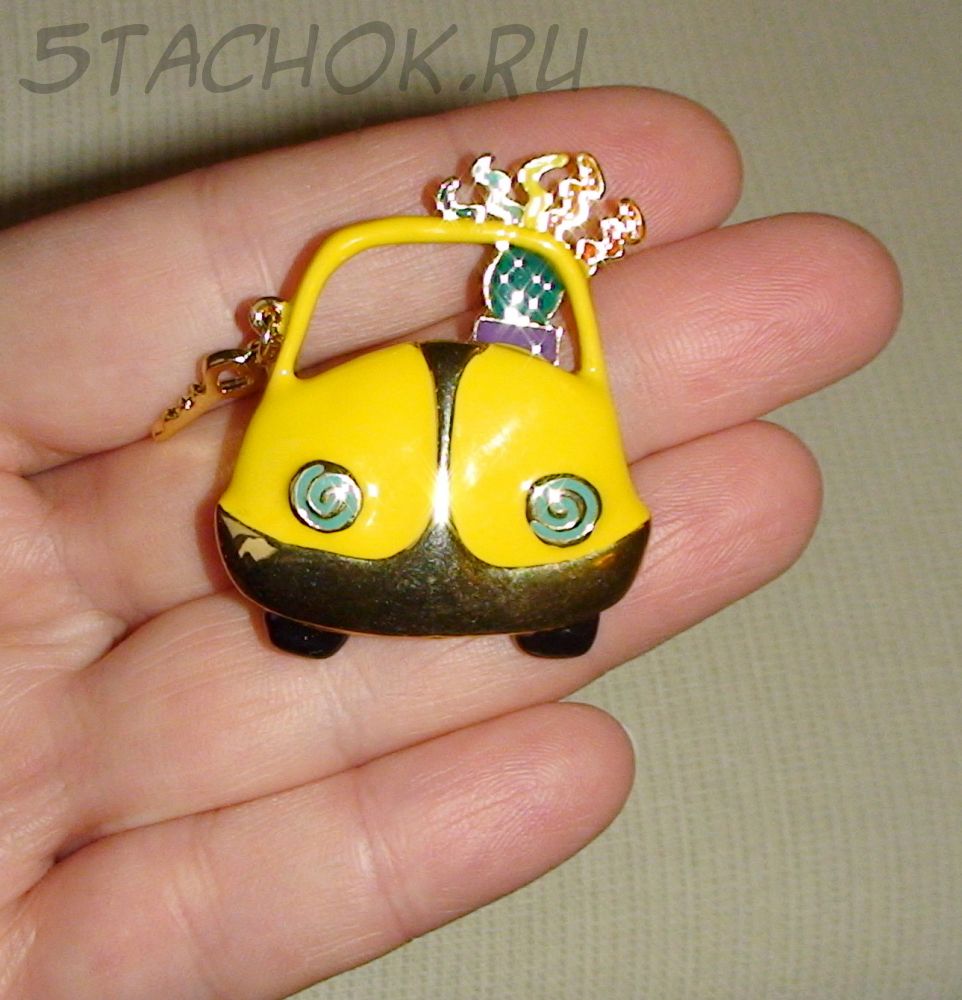 У дамы зеленое лицо, волосы, которые встали дыбом, всех оттенков радуги,свитер сиреневого цвета, сама машинка-жук ярко-желтого цвета, фары голубенькие, колесики черные, а бампер, ключик под блестящее золото!
