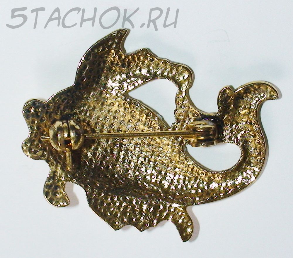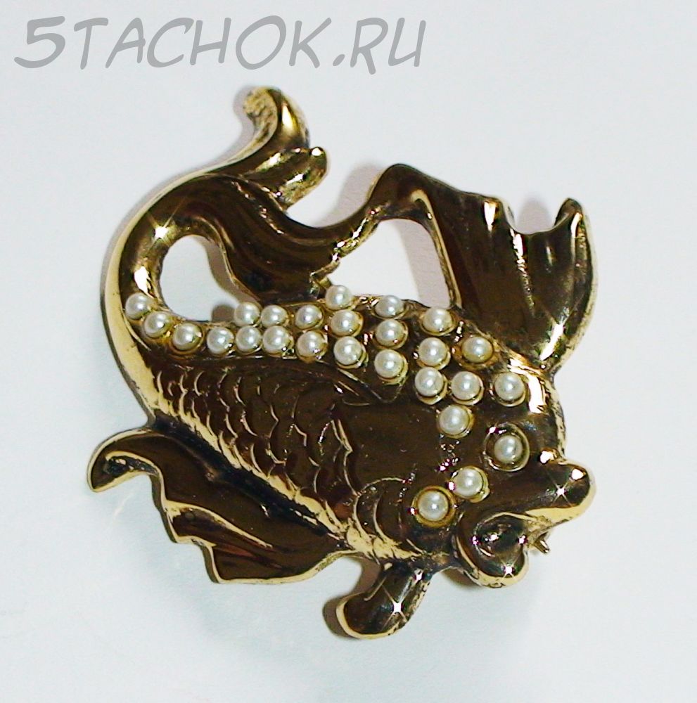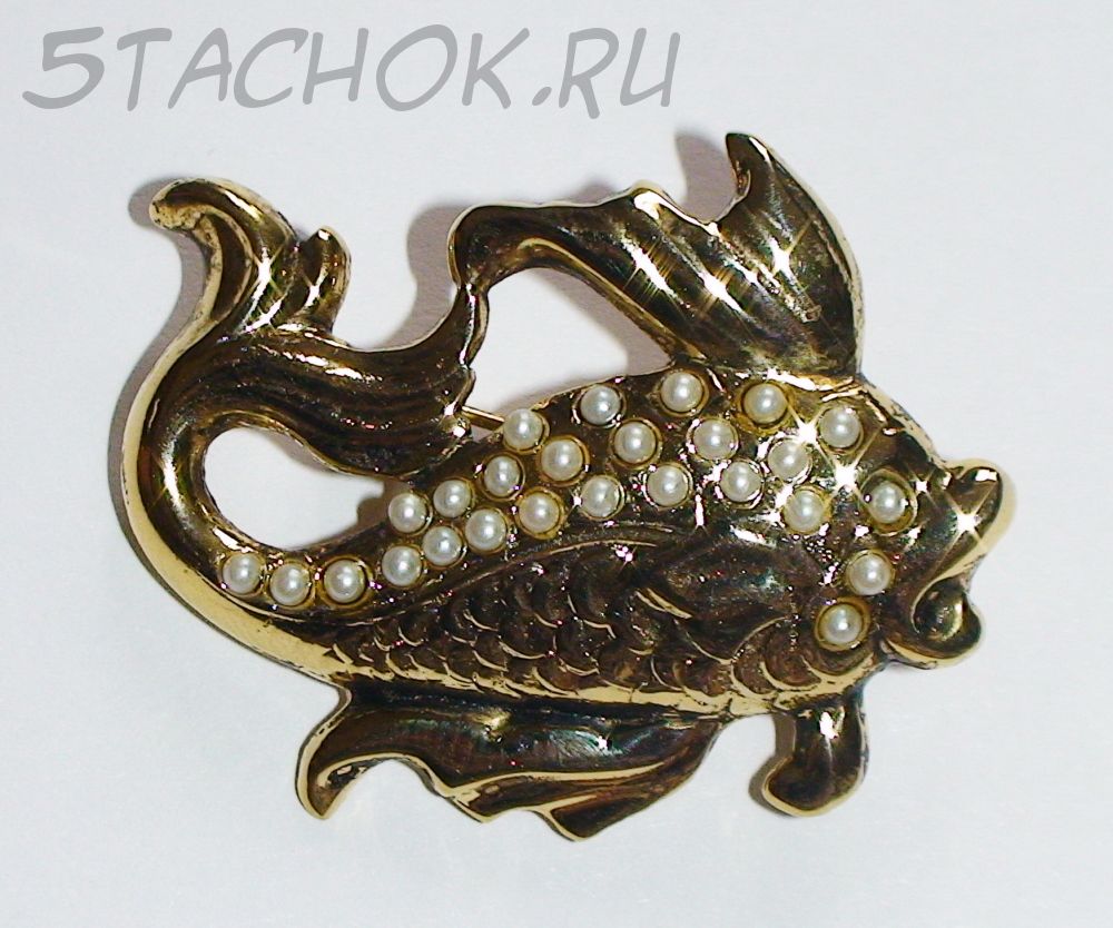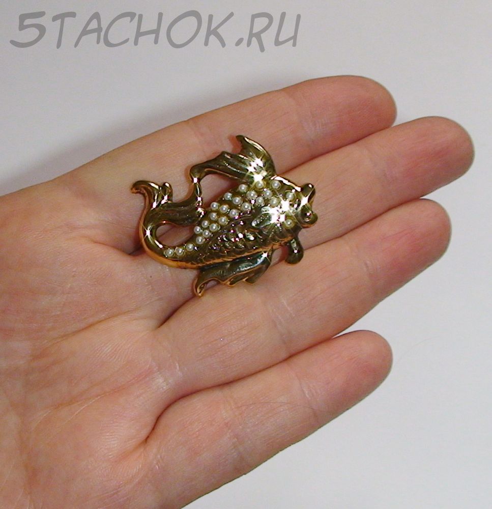 Рыбка выполнена в металле под блестящее золото с использованием маленьких перламутровых камушков под жемчужинки!