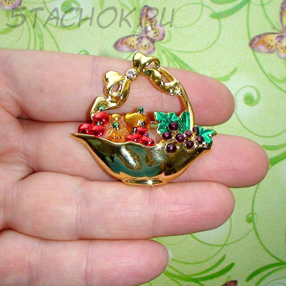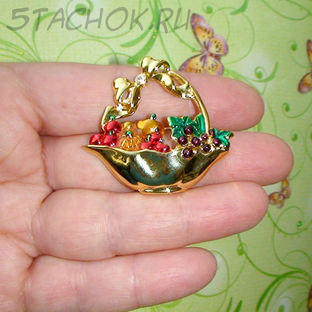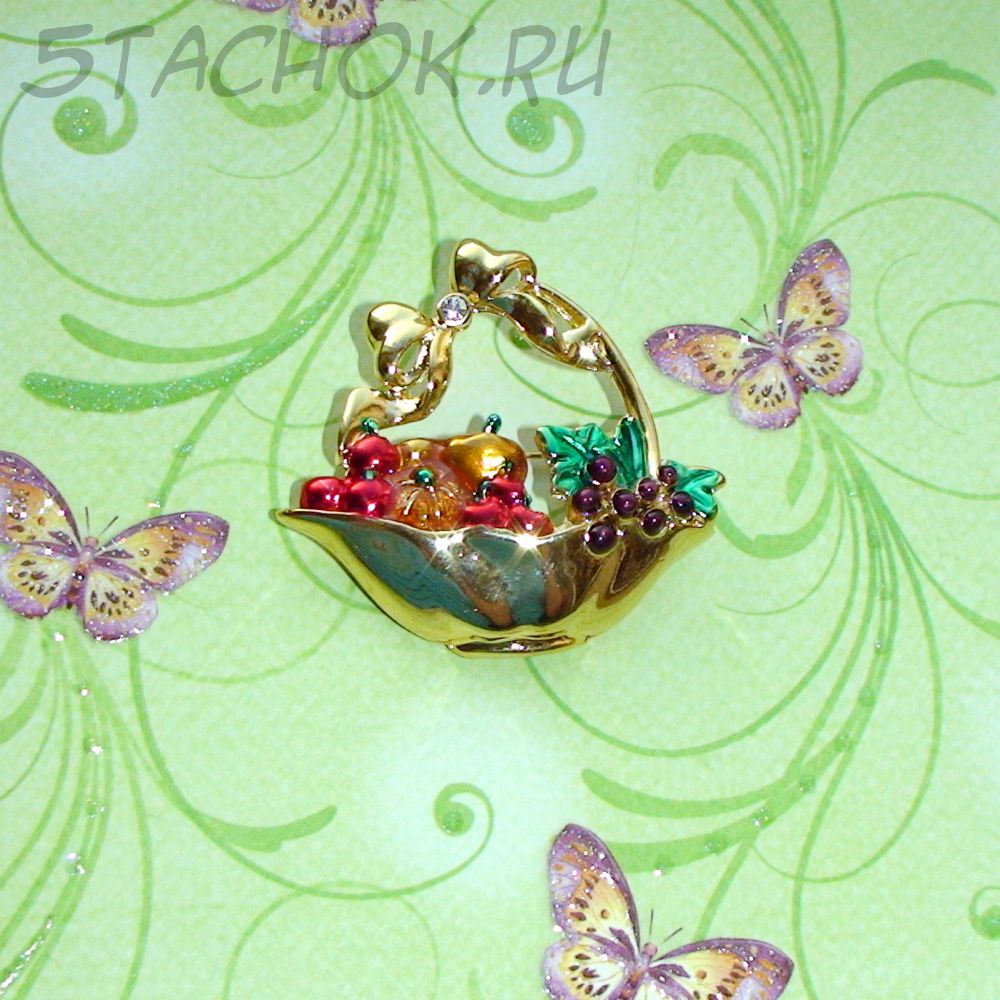 Брошь выполнена под блестящее золото с использованием блестящей перламутровой эмали. В корзинке видны фрукты: темный виноград, апельсины, яблоки и ягоды. Корзина украшена бантиком со стразиком, который ярко переливается на свету!