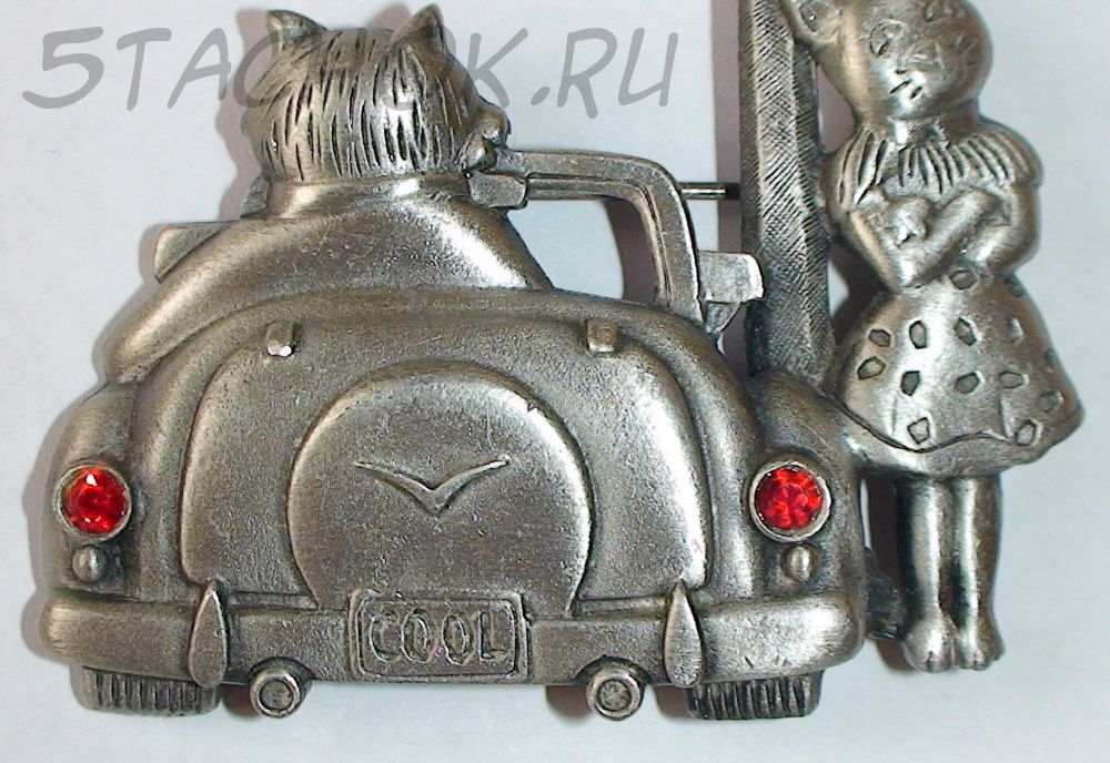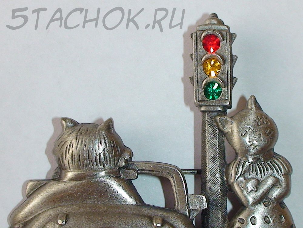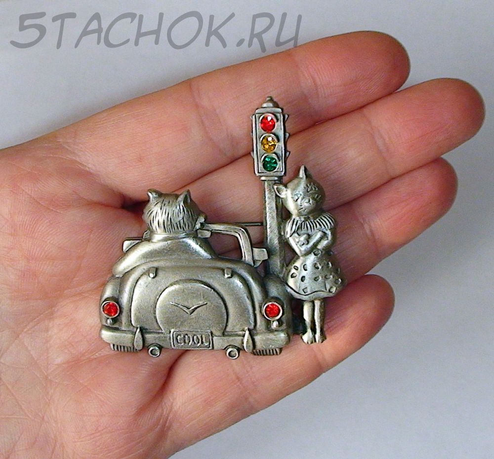 Брошь "Кот в лимузине и кошка у светофора" с цветными камушками под олово