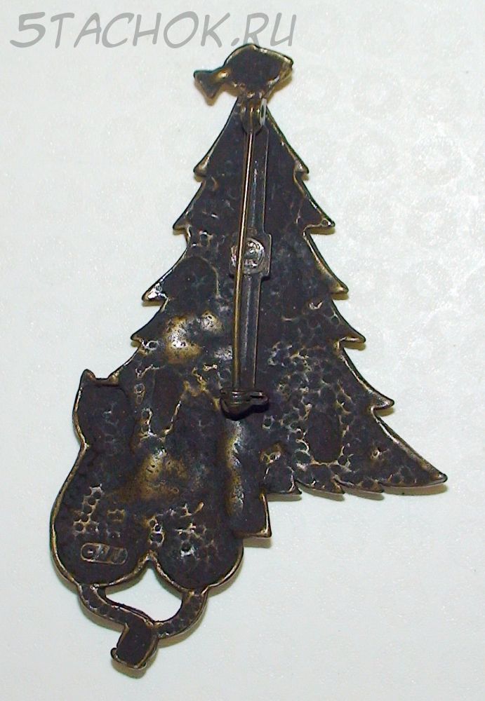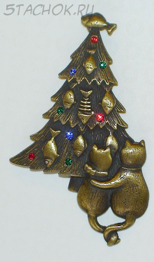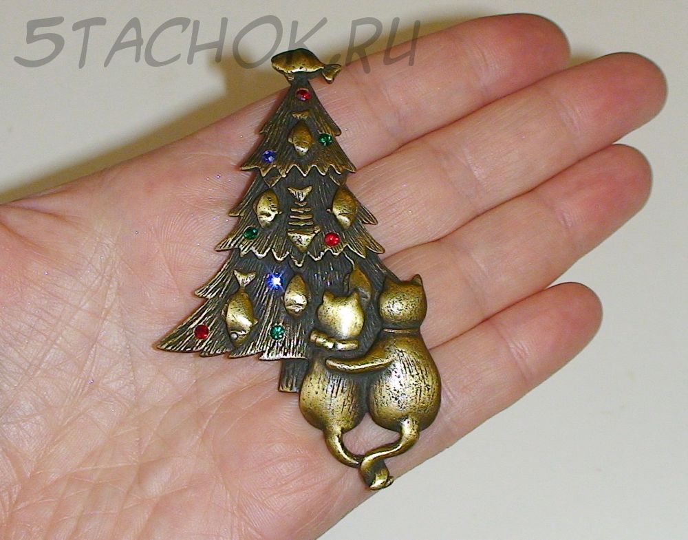 Брошь "Кот и кошечка у новогодней елочки" под бронзу с камушками сваровски