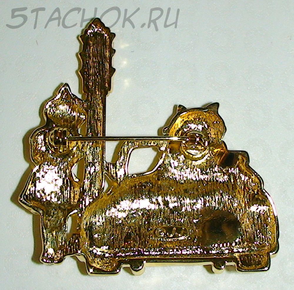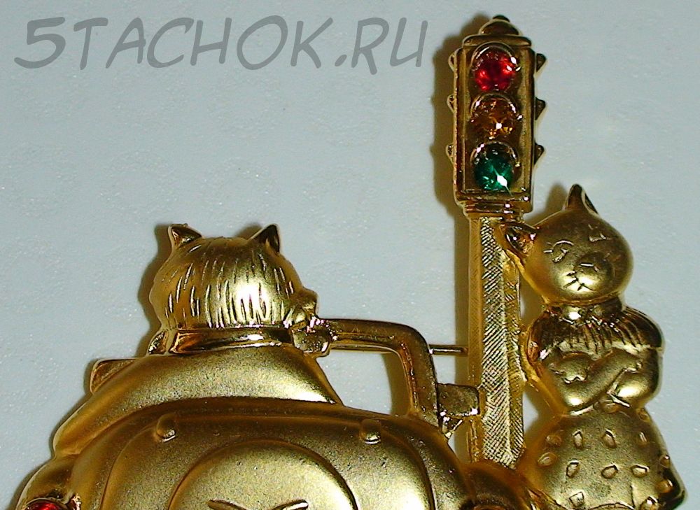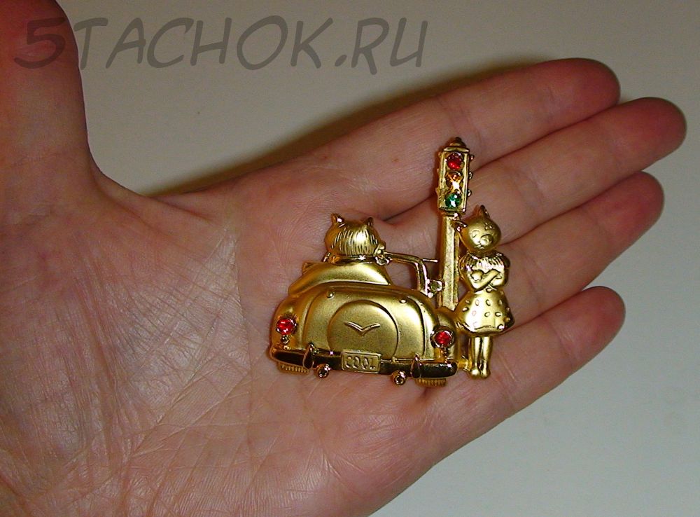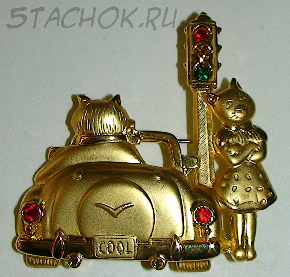 Брошь "Кот в лимузине и кошка у светофора" с цветными камушками под золото