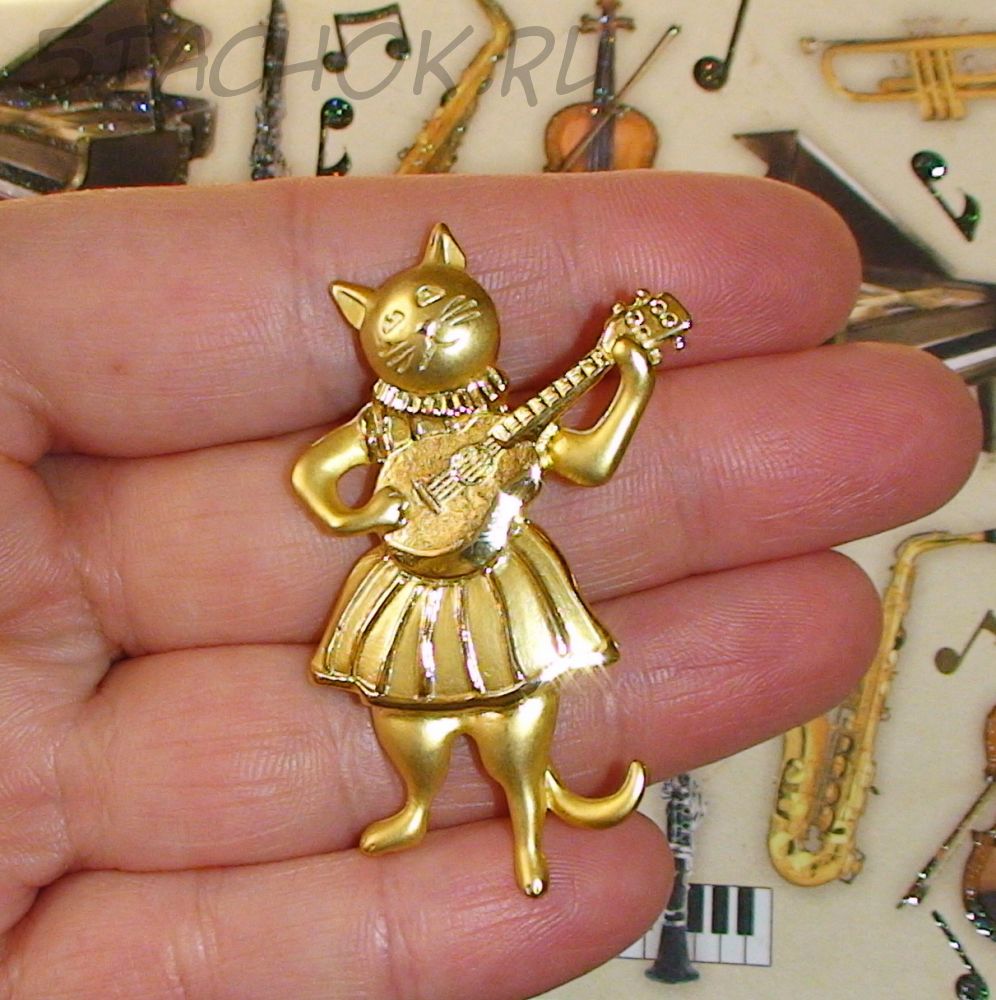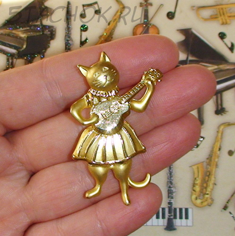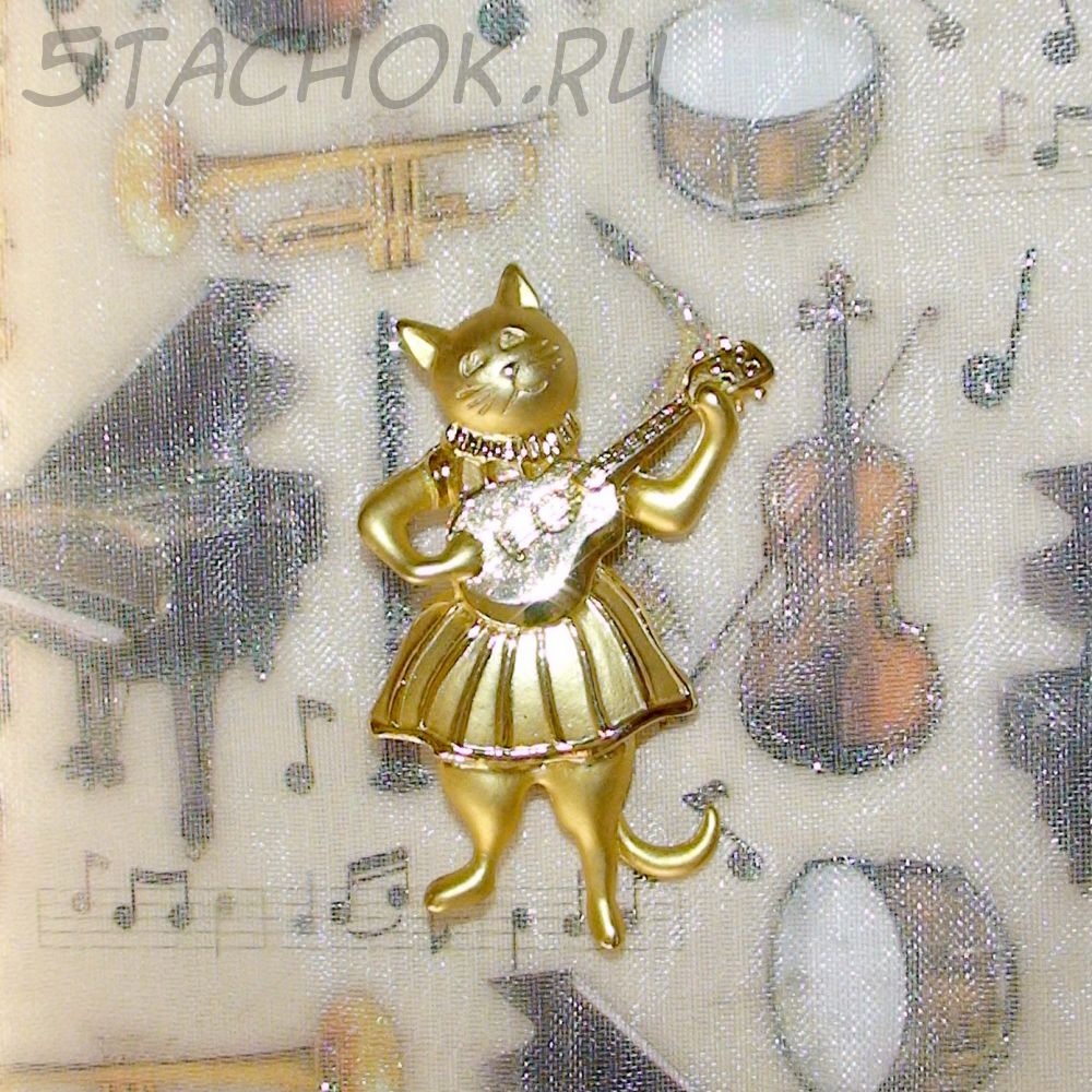 Брошь "Киса с гитарой" под золото