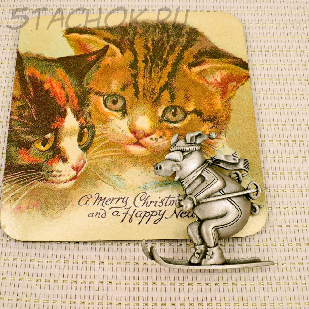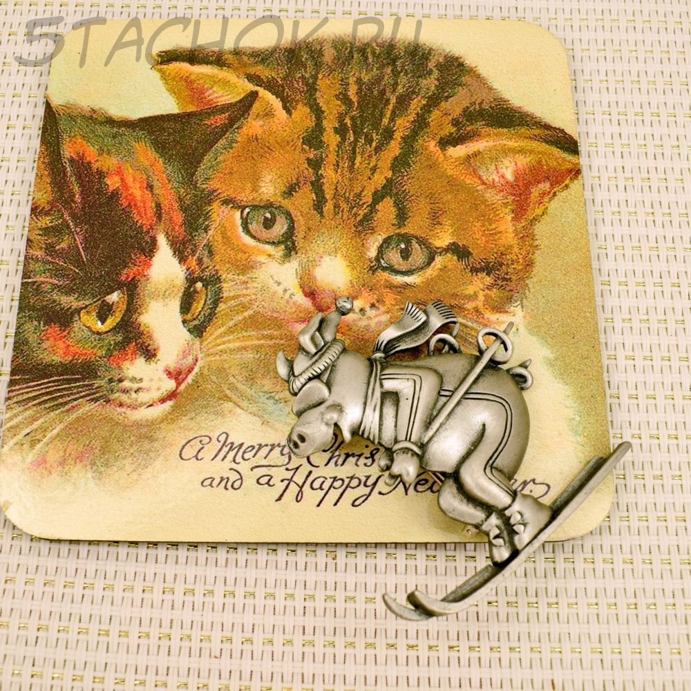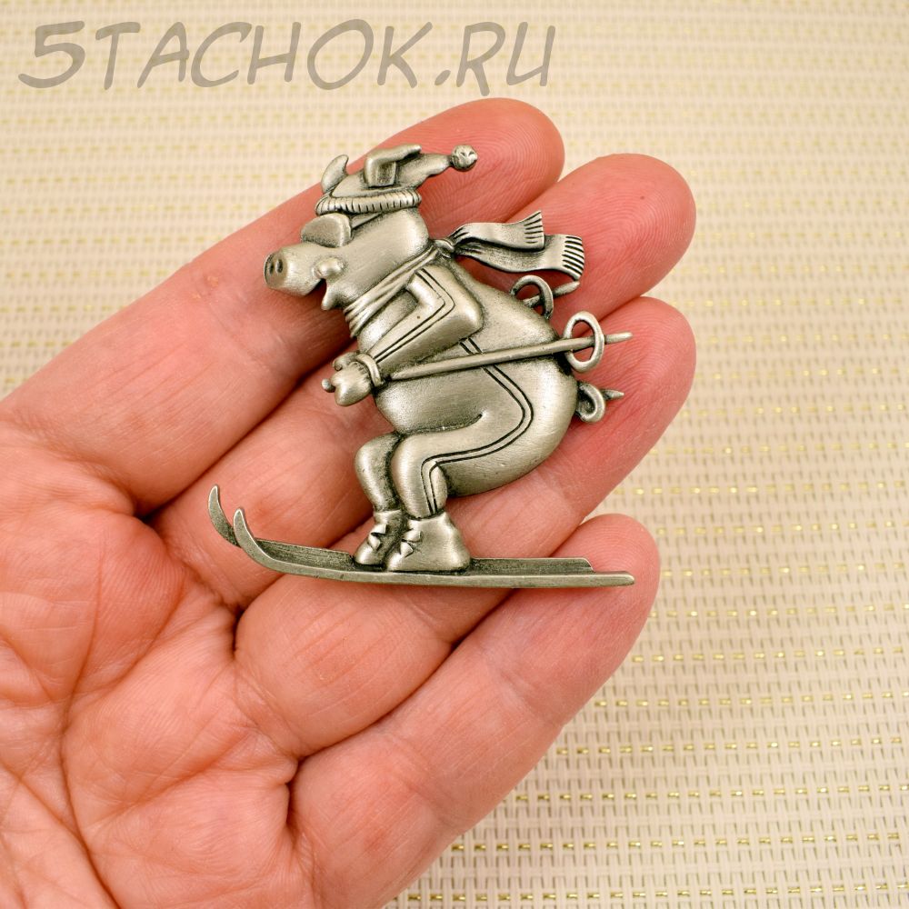 Жизнерадостный спортиный хрюшка в полном горнолыжном обмундировании едет на лыжах с горки!