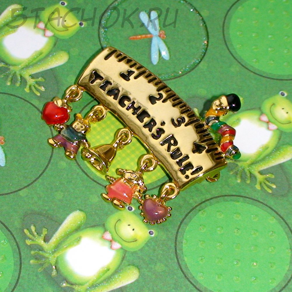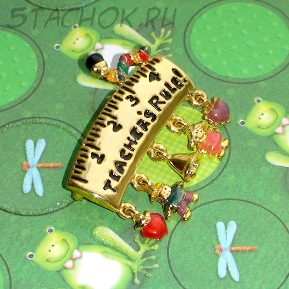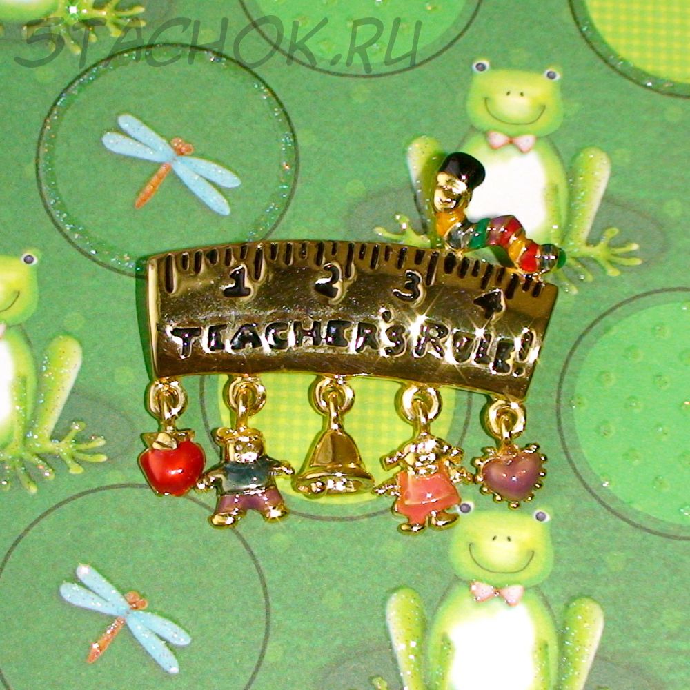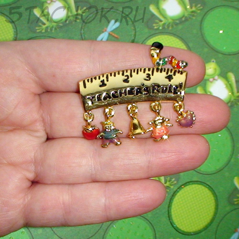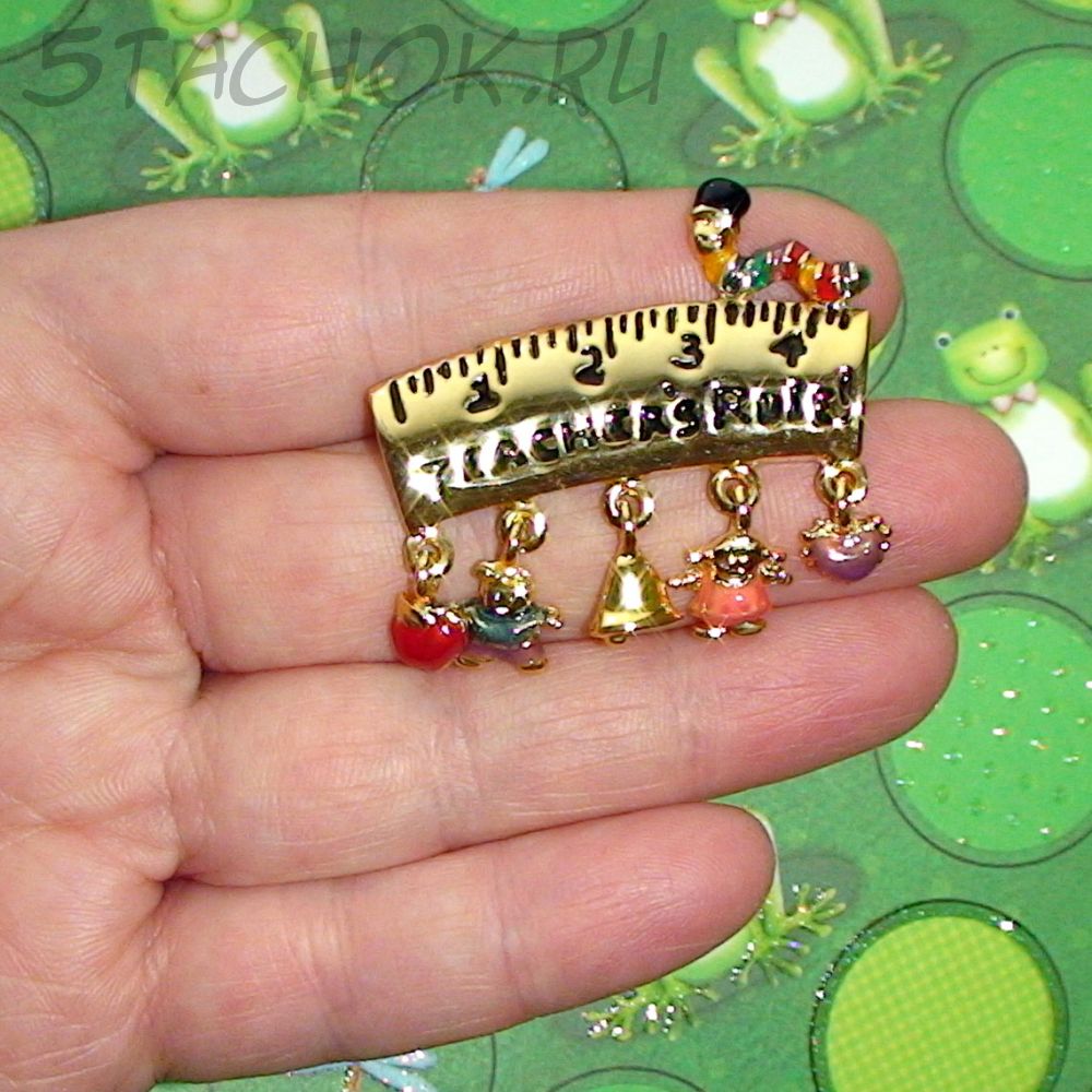Брошка стилизована под линейку, на которой написано "Учительское правило". Под ней подвижно расположены мальчик и девочка, школьный звонок, яблочко и сердечко, на линейке - веселая гусеничка. Яркая эмаль нежных цветов и блестящий золотистый цвет придают брошке очарование, хочется все время ее рассматирвать!