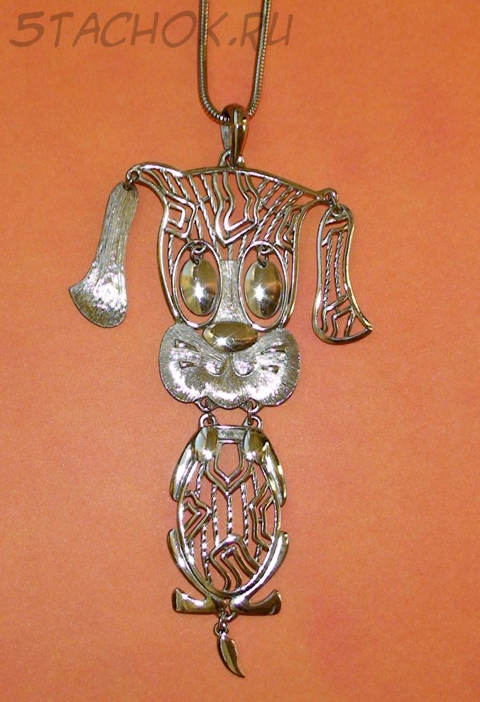 Очень редкое и оригинальное колье! У песика много подвижных деталей: ушки,глазки,мордочка, хвостик! Много ажурных деталей, прорисованы шерстка, мордочка! И даже ушки у песика разных рисунков! Очень напоминает героя мультфильма бассет-хаунда "Друпи"!
