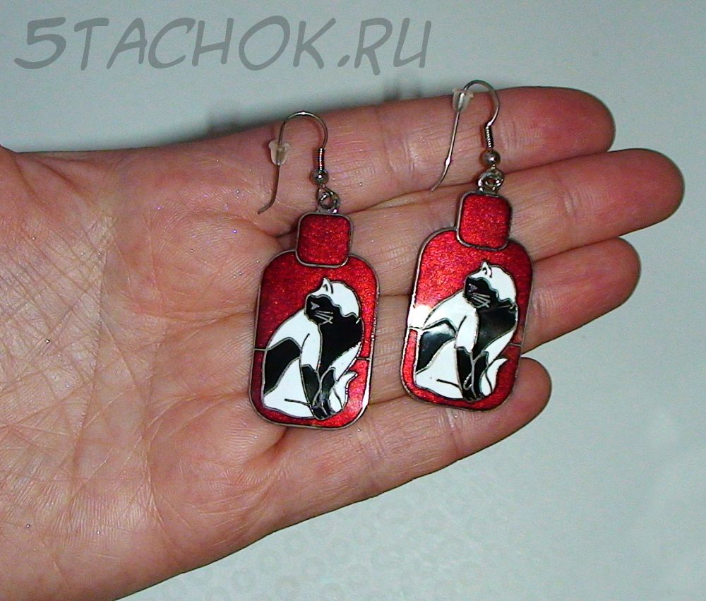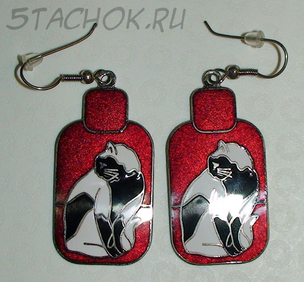 Серьги "Черно-белая кошка на красном" под серебро, ювелирная эмаль