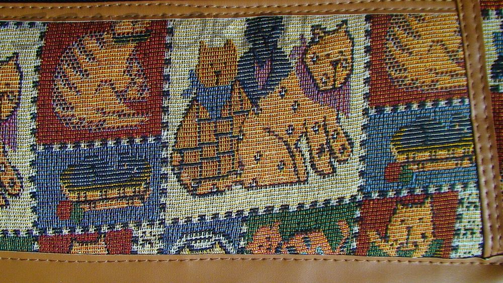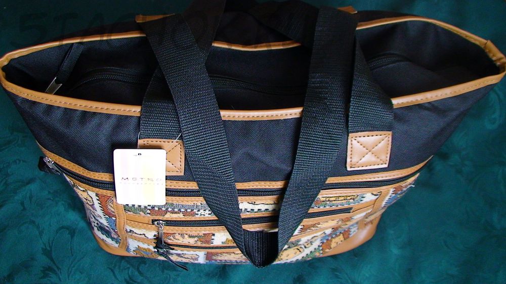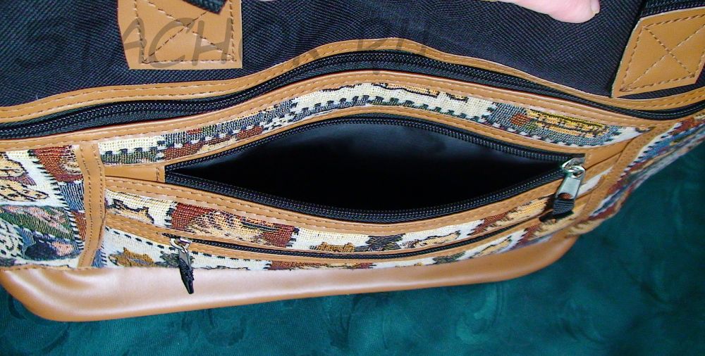 Сумка сшита из плащевки с использованием трикотажной ткани под гобелен, отделка искусственная кожа. Внутри одно большое отделение на замке сверху (помещает 3 комплекта постельного белья!), сбоку на замках большой карман, средний и малый.