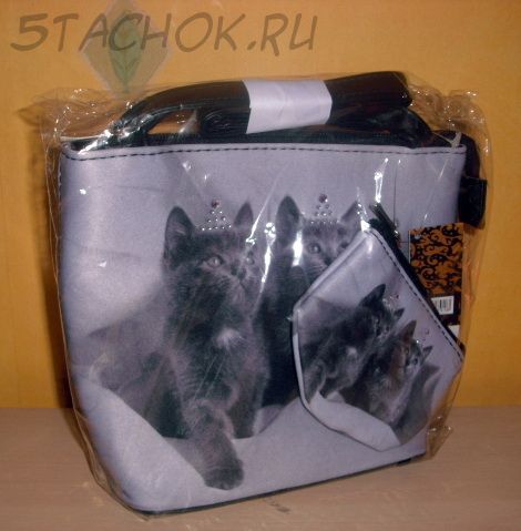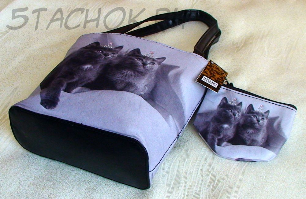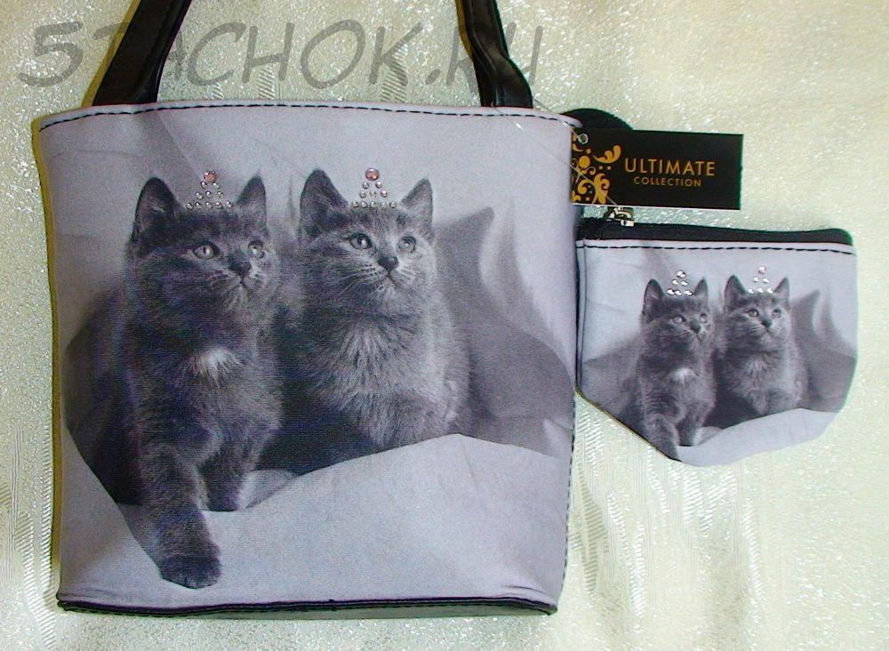 Сумочка плотная, обтянута тканью из полиэстра, дно, верх и ручки из искусственной кожи. рисунок котят с обоих сторон и на сумочке, и на кошелечке. Закрываются на молнию. Оформлены стразиками. Ширина сумочки 19,5см, высота без ручек 16см, высота с ручками 31,5см Ширина кошелечка 9,5см, высота 8см Куплены на аукционе. Производство Великобритания.