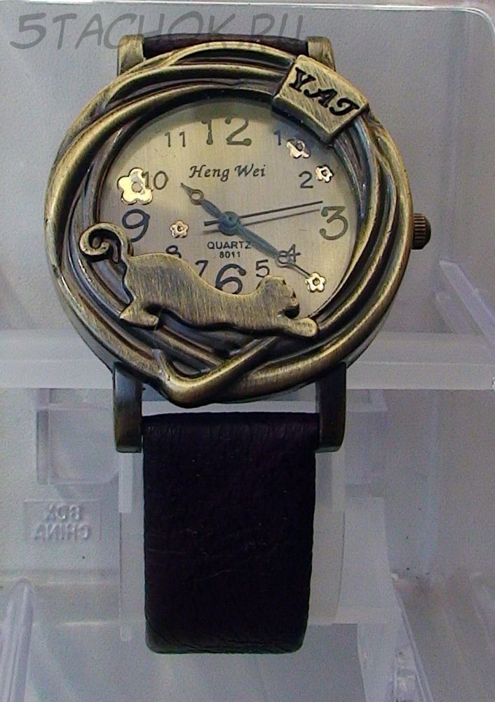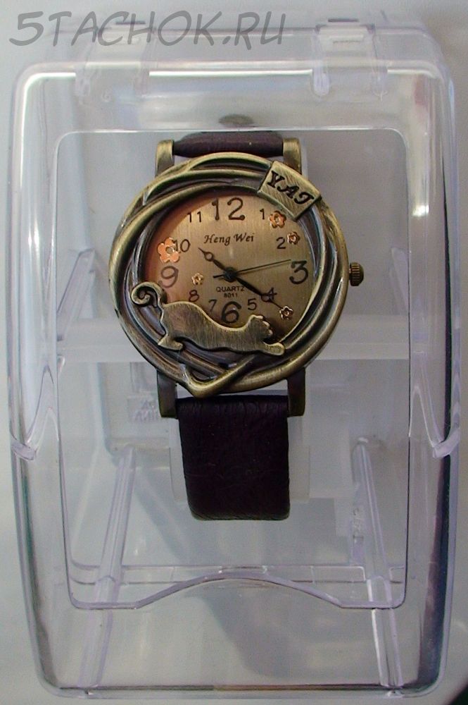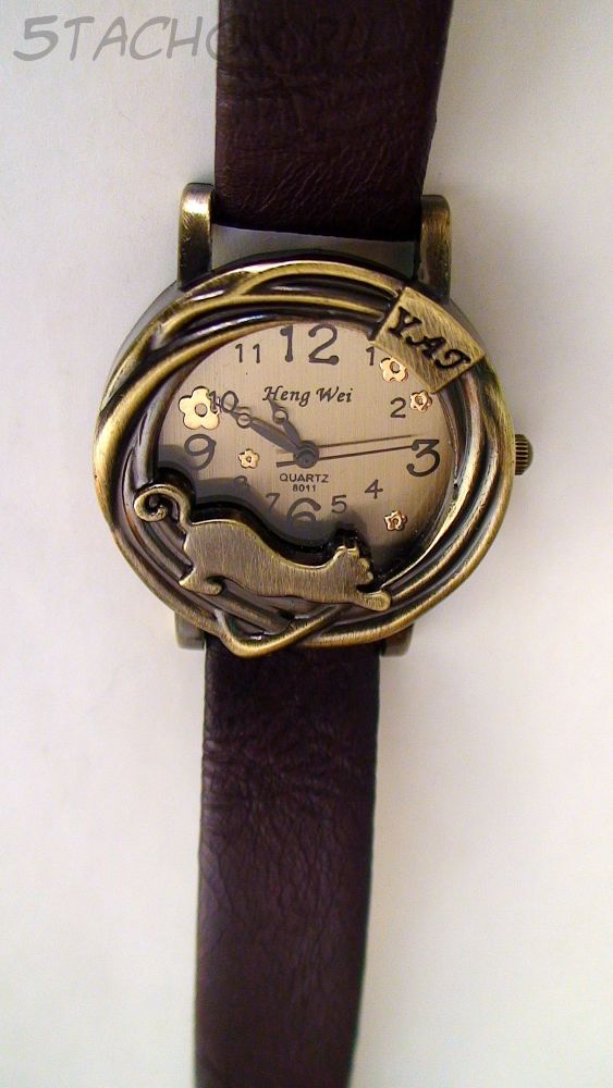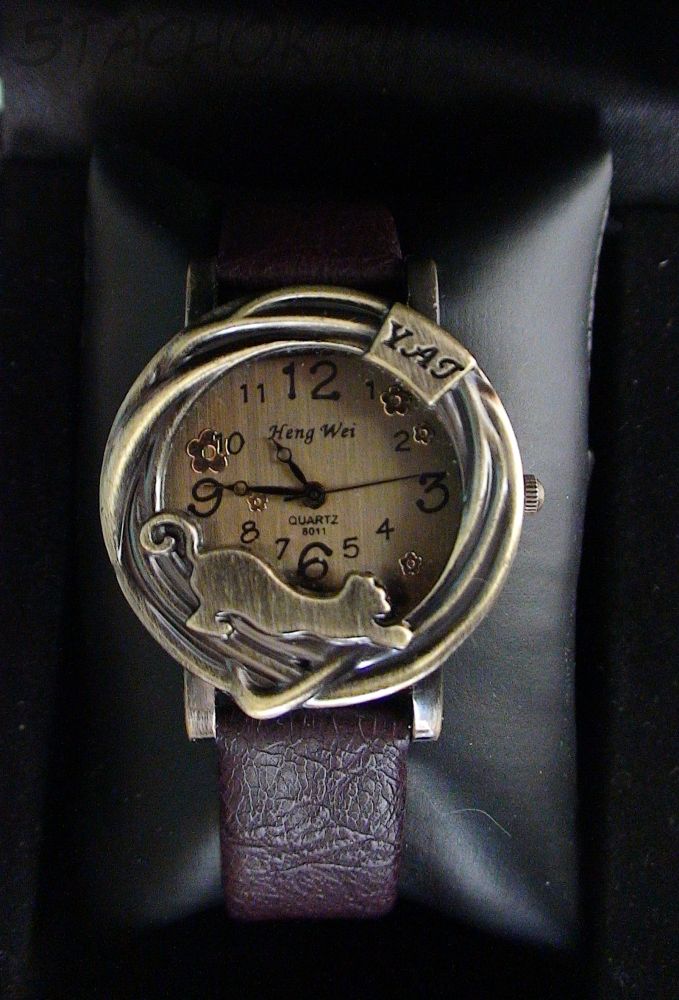 Часы женские "Кошка" под бронзу с коричневым ремешком