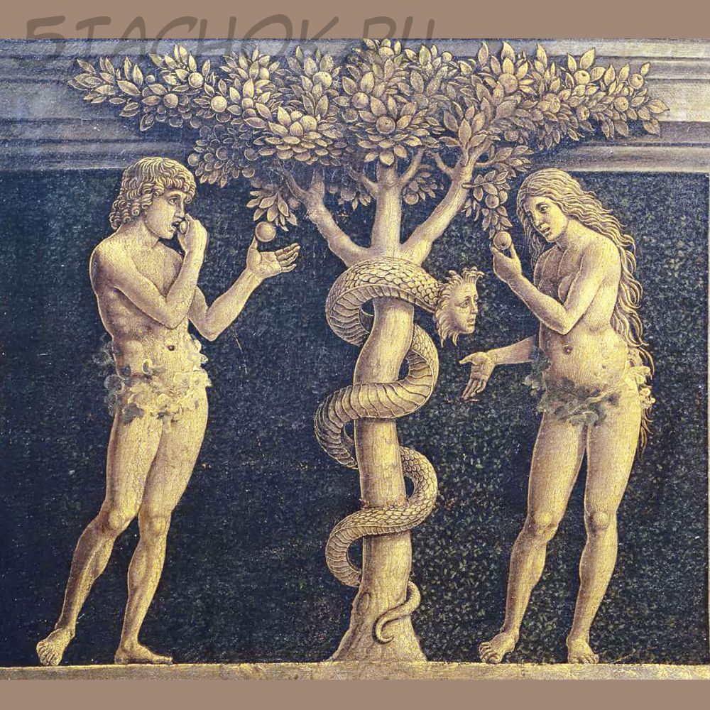 Библейская тематика. Адам и Ева лежат в Эдемском саду у древа познания добра и зла, где запретный плод еще нетронут. Но змей-искуситель уже тут как тут...