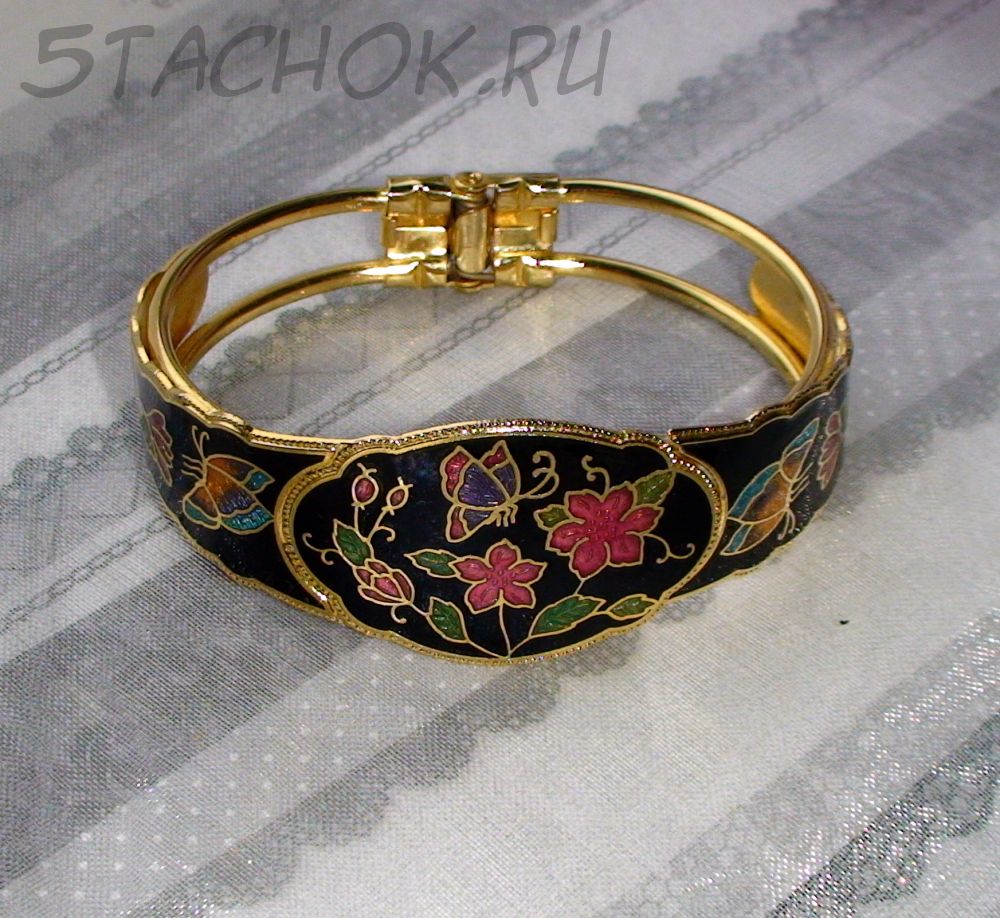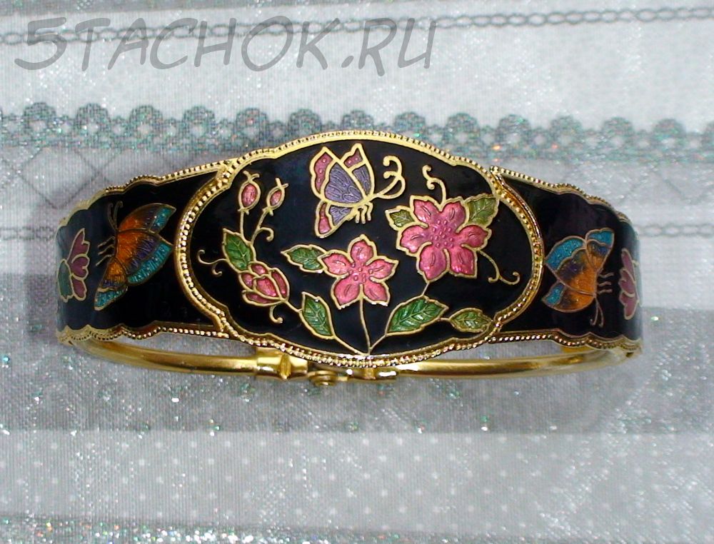 Браслет "Бабочки и цветы на черном" под золото/клуазоне