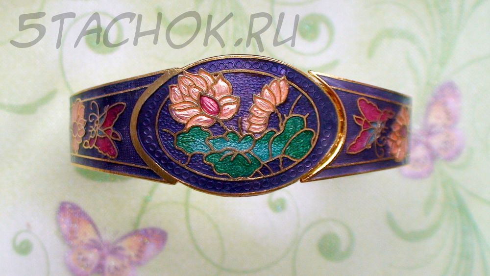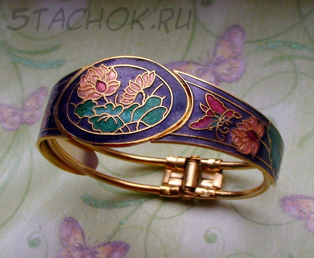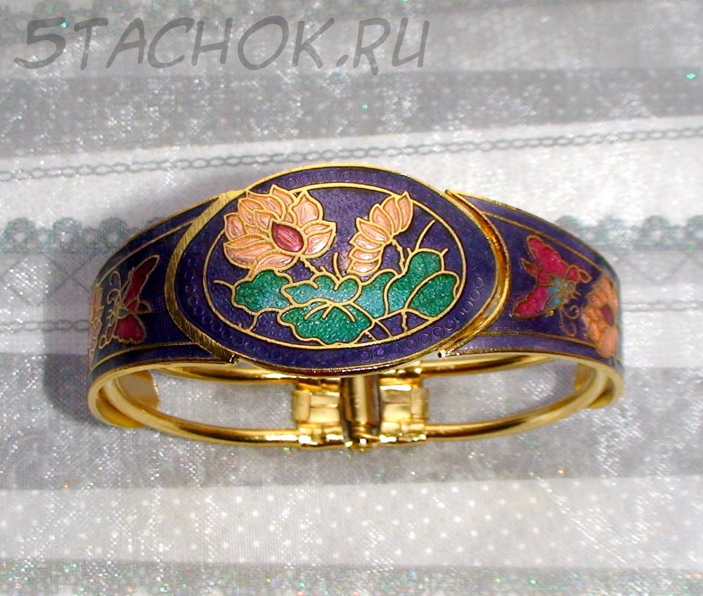Браслет "Бабочки и цветы на синем" под золото/клуазоне
