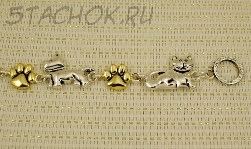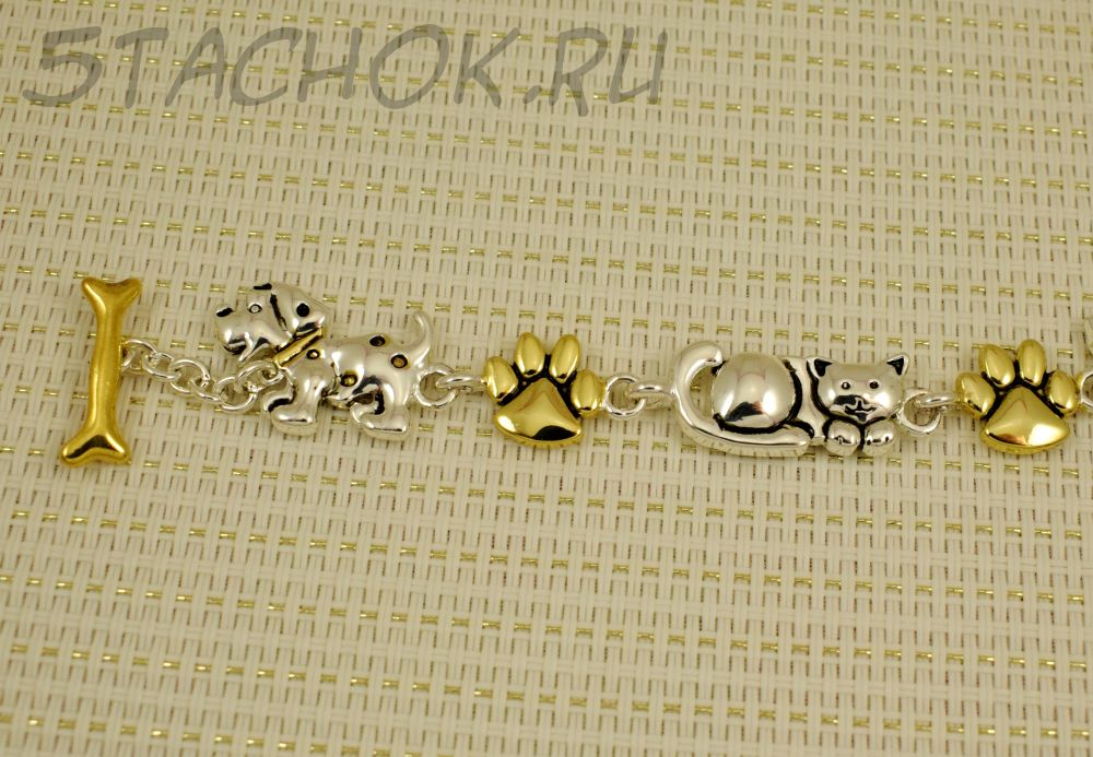 Чудесный, редкий браслет. Выполнен в цвете блестящего черненого серебра и золота. На браслете изображены 2 котика и 2 песика (все разные). Все элементы браслета объемные двусторонние. Длина браслета 19см. Длину можно уменьшить за счет снятия звеньев у застежки до 17,5см Винтаж 1980-х гг Браслет в безупречном состоянии, изделие ранее не использовался. Производство Premier Design (США) Маркирован