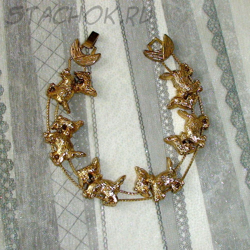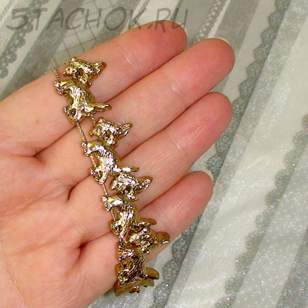Симпатичный браслетик. Выполнен в блестящем золотом исполнении с прорисованной фактурой шерсти песиков. Песики подвижны вдоль веревочек. Общая длина браслета 20см, но она может быть и уменьшена. Отличный подарок любителю терьерчиков и песиков! Общая длина браслета 20см Немаркировано. Коллекционная винтажная бижутерия 1980-е годы. Производство США Отличное винтажное состояние. Изделие ранее не использовалось.