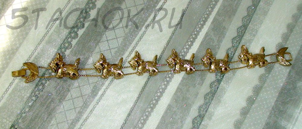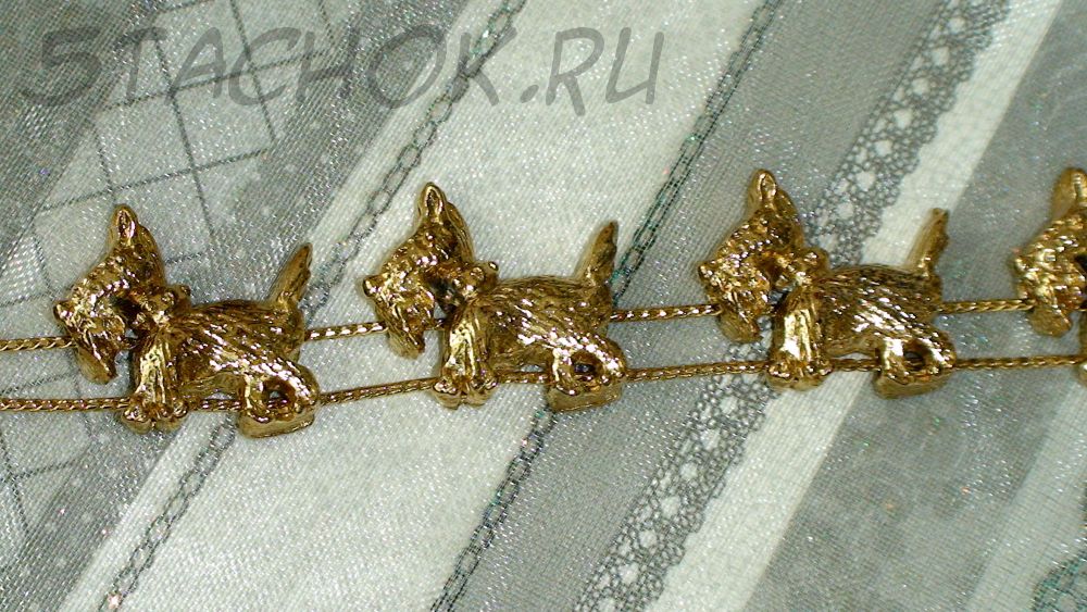Симпатичный браслетик. Выполнен в блестящем золотом исполнении с прорисованной фактурой шерсти песиков. Песики подвижны вдоль веревочек. Общая длина браслета 20см, но она может быть и уменьшена. Отличный подарок любителю терьерчиков и песиков!