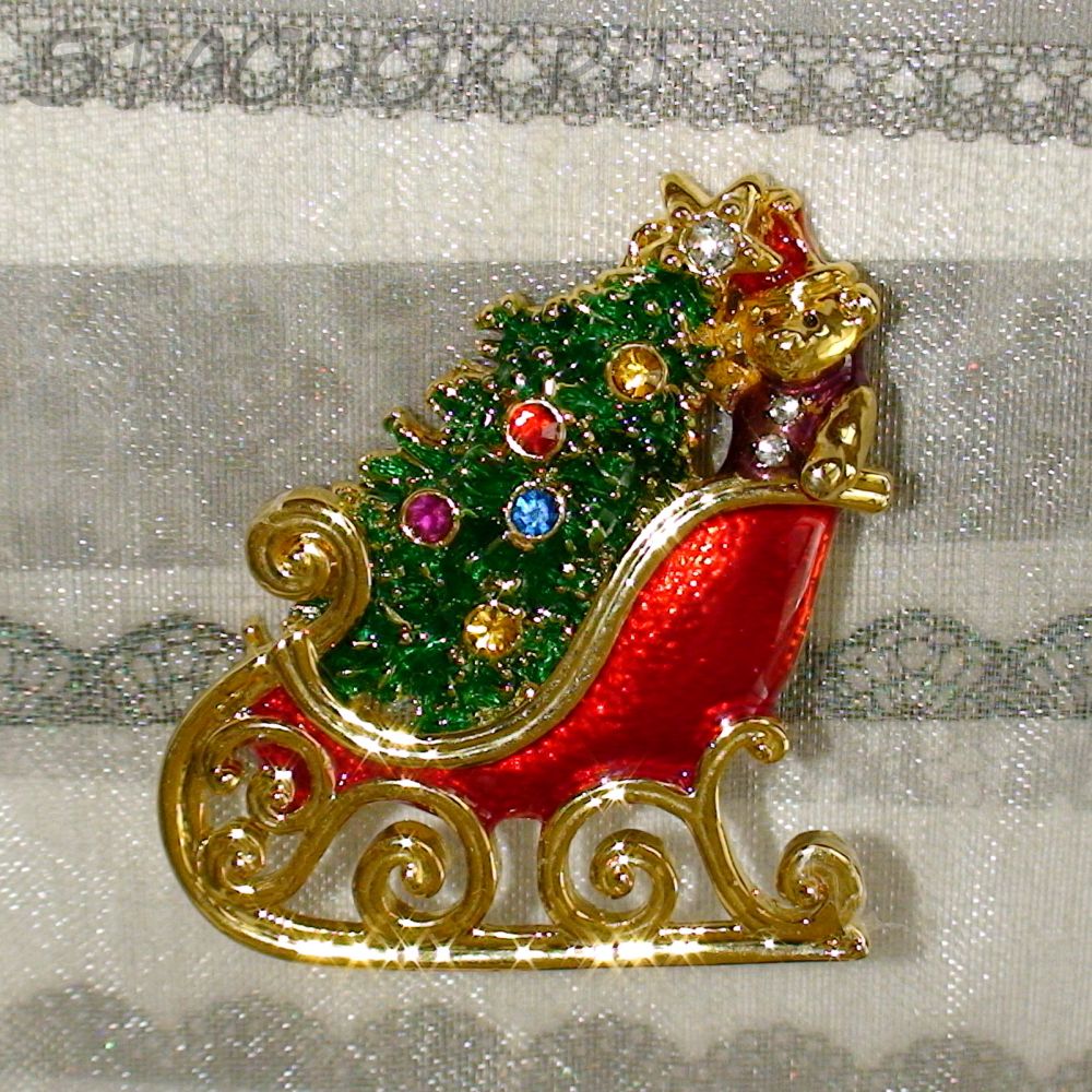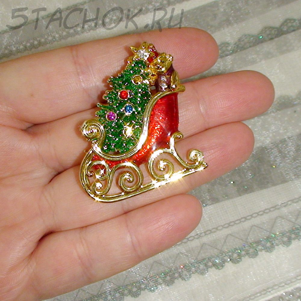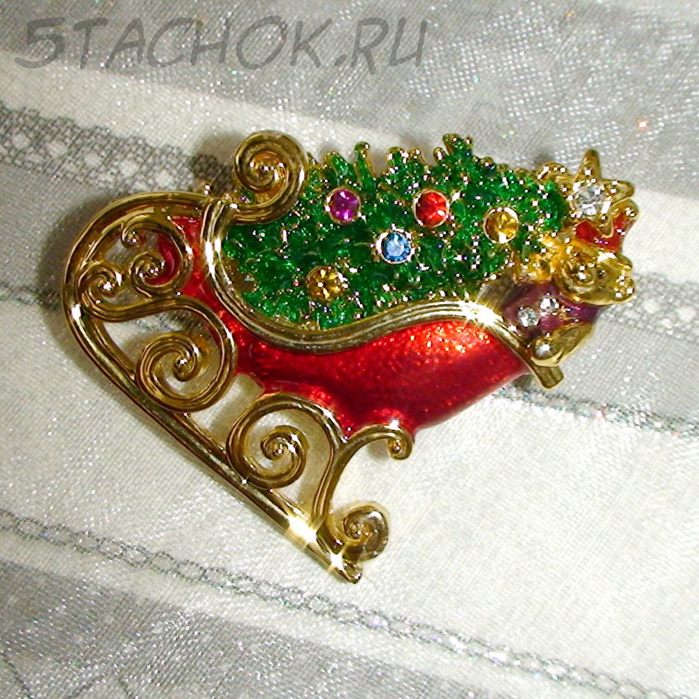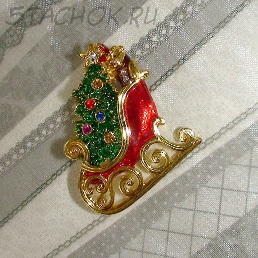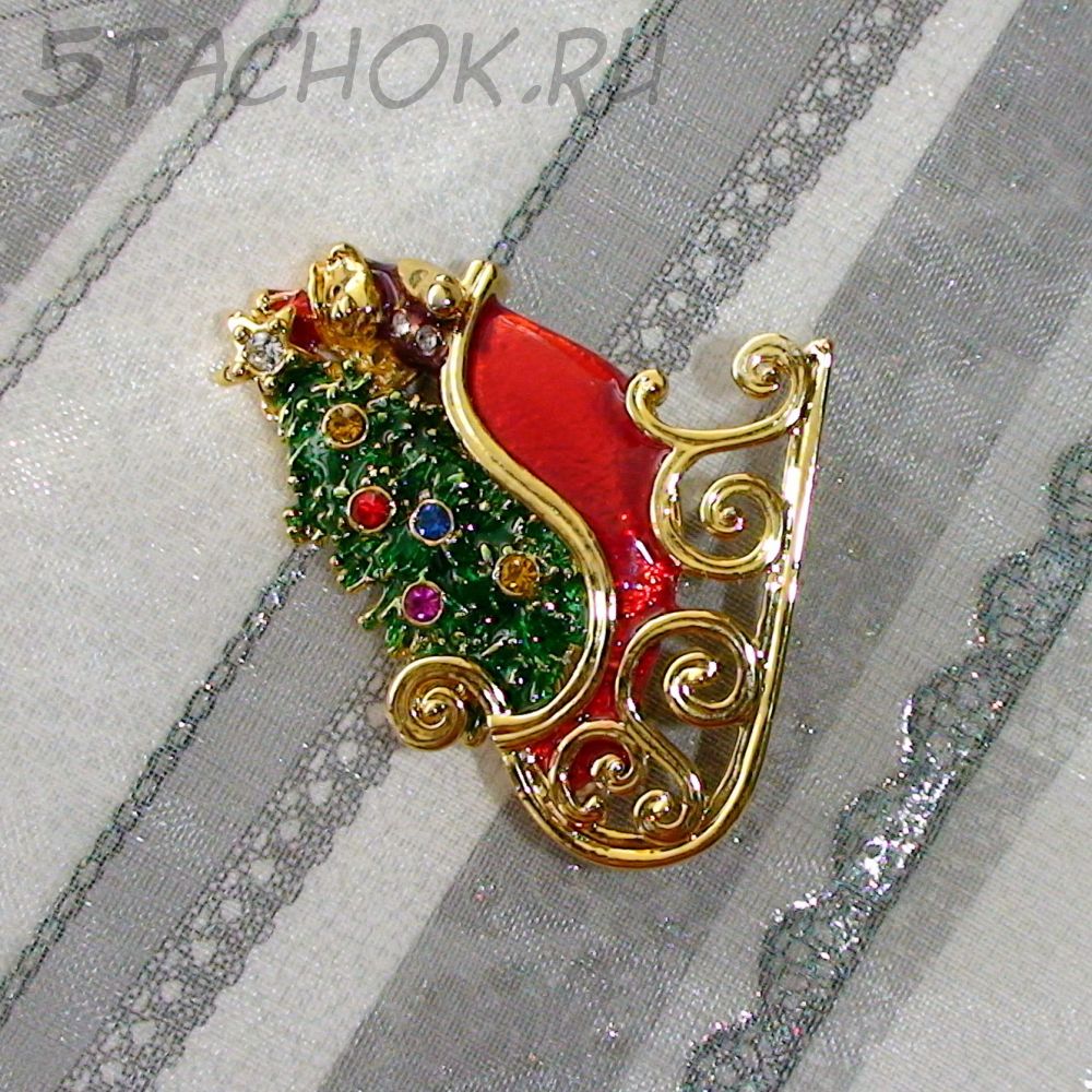 Брошь Новогодние саночки под золото, стразы, эмаль